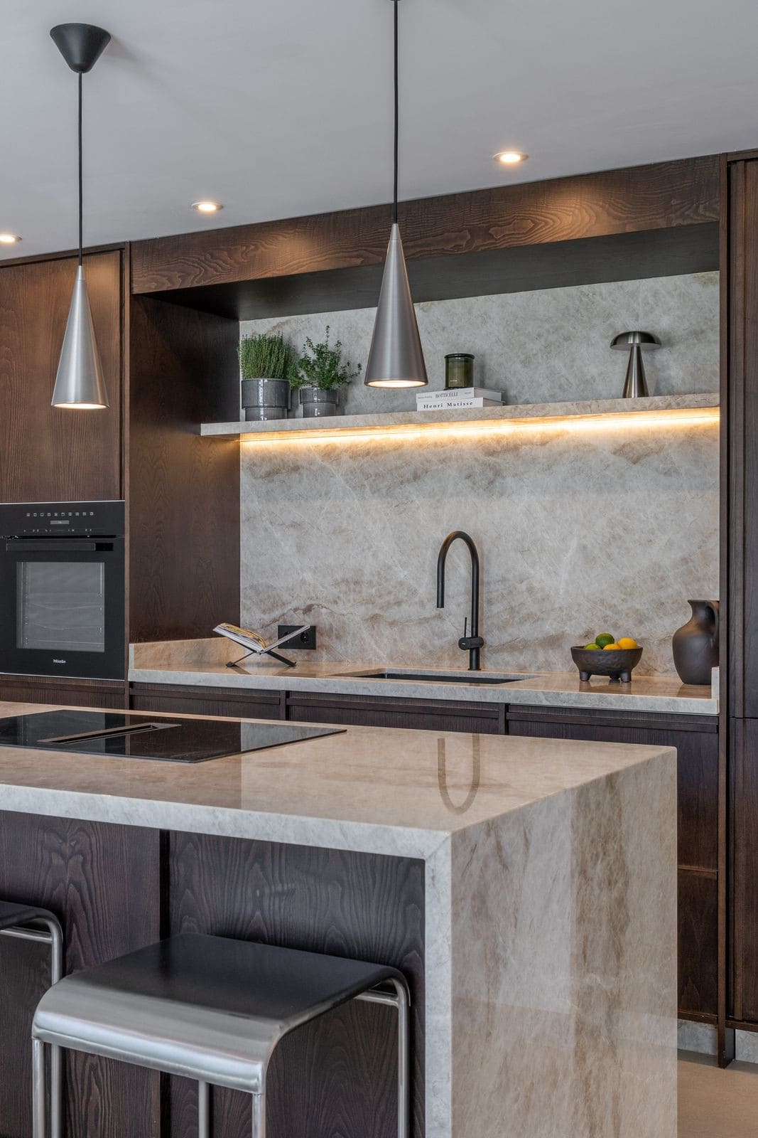 The master bedroom has direct terrace access and sea views, while both guest bedrooms feature en-suite bathrooms. Finishes are of the highest quality, including designer appliances, elegant flooring, and refined décor.