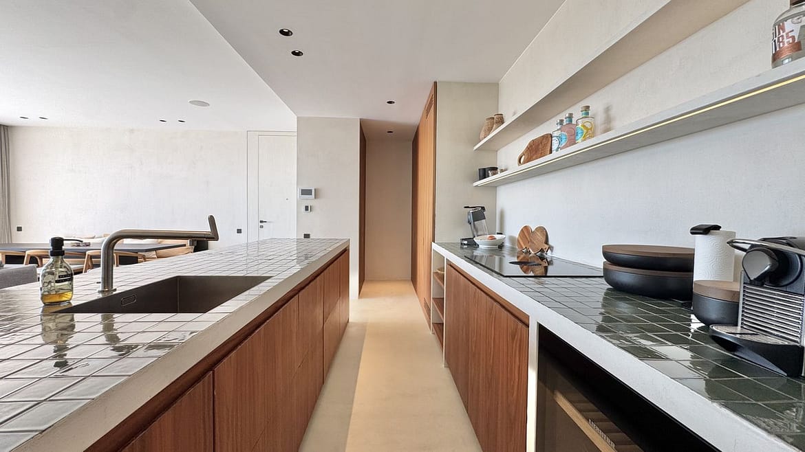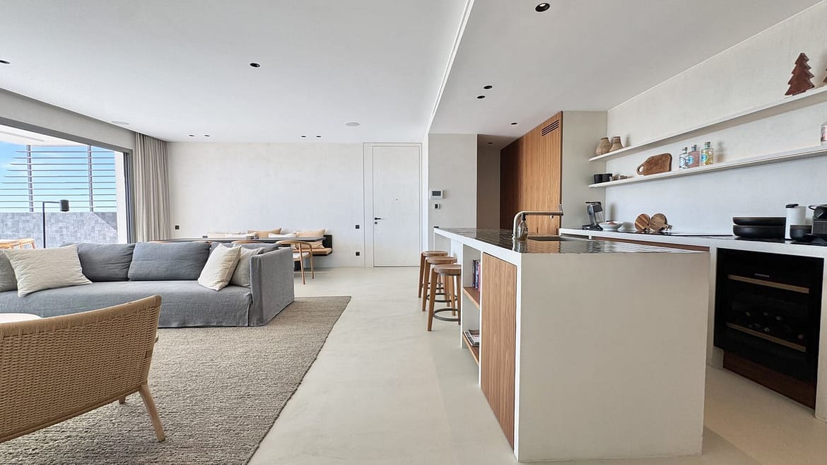The apartment features an open plan kitchen with Smeg appliances and a living room with large sliding doors to the terrace boasting panoramic views to the surrounding landscape, La Quinta Golf and the Mediterranean beyond.