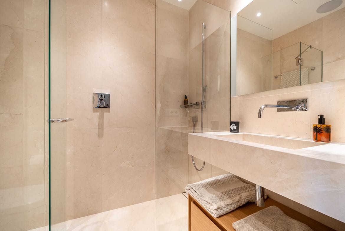 With three spacious bedrooms and three elegant bathrooms, every corner of the home exudes quiet luxury. The master suite is a private retreat, and all bedrooms offer tranquil garden or hillside outlooks. Underfloor heating throughout ensures year-round comfort, while a separate utility room adds daily convenience.