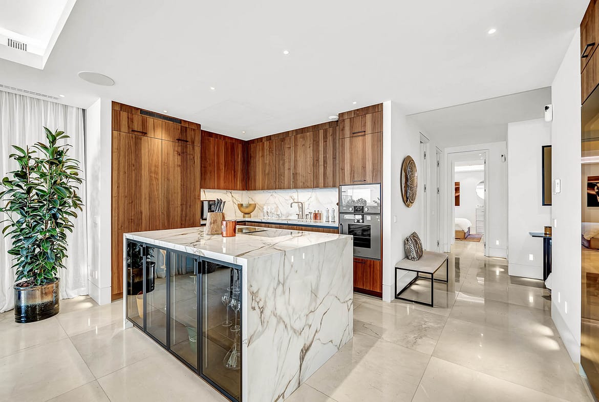 The fully equipped kitchen is a chef’s dream, fitted with top-of-the-line Gaggenau appliances and an stylish drinks cabinet, offering the perfect setting for entertaining. The open-plan design flows seamlessly into the expansive outdoor area—one of the apartment’s most impressive features. The spacious terrace offers a fully equipped barbecue area, a luxurious Jacuzzi, and breathtaking views, creating the ideal space for relaxation or hosting unforgettable gatherings in the Mediterranean climate.