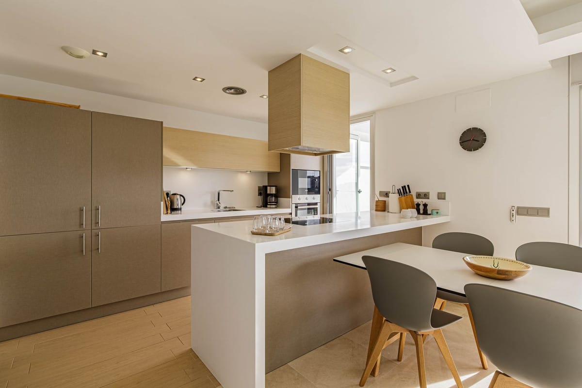 The bright open-plan living and dining area flows seamlessly onto the spacious terrace, creating a wonderful indoor–outdoor living space to enjoy the Costa del Sol climate all year round. Floor-to-ceiling glass doors maximise natural light and frame the views over the landscaped gardens, pool and surrounding fairways. The fully fitted contemporary kitchen is equipped with quality appliances and offers ample storage, while a separate utility room adds extra practicality for everyday living.