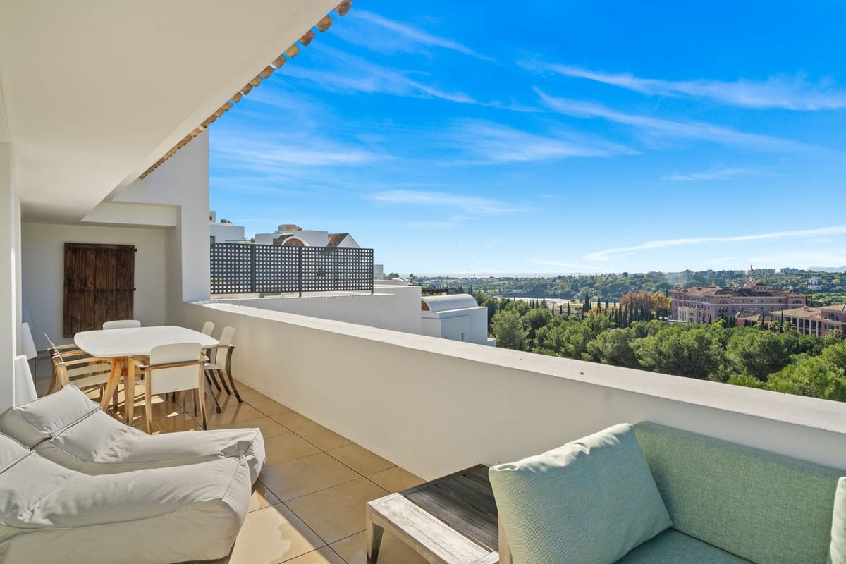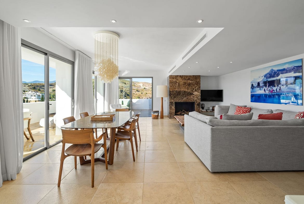 Step outside onto the expansive terrace, complete with a dining area, lounge space, private pool, and breathtaking panoramic views of the sea, mountains, golf courses, and the prestigious Villa Padierna.