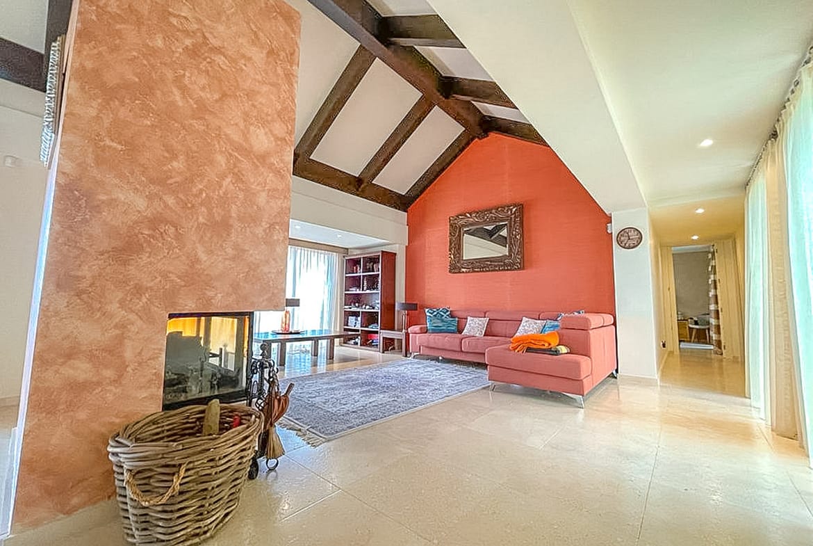 It has a wonderful and spacious living room, accompanied by a fireplace and a dining area.