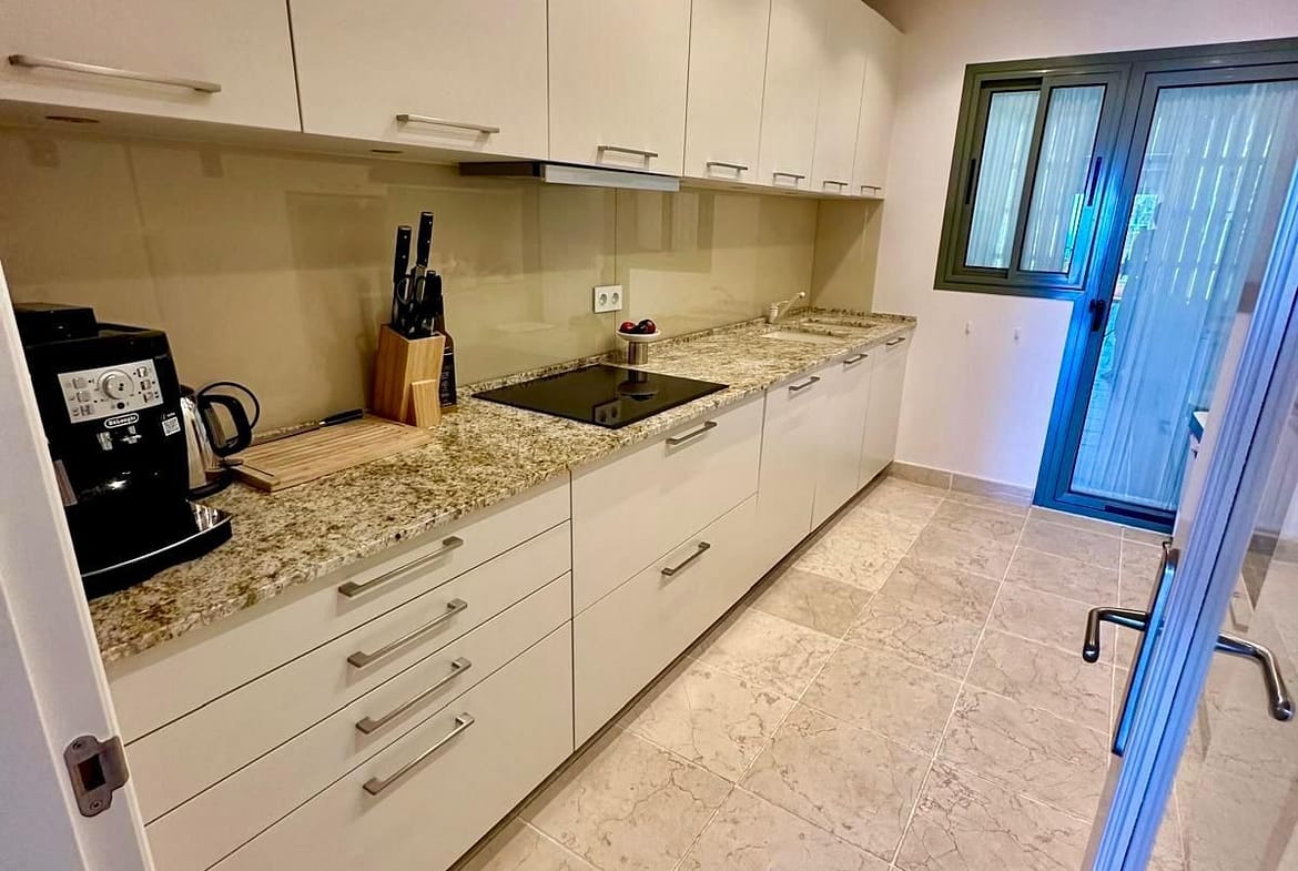 The fully equipped kitchen includes a separate utility room, blending convenience with practical functionality. The main bedroom features an en‑suite bathroom and direct access to a private open terrace with breathtaking sea and garden views. A second bedroom, bathed in morning sunlight, also includes an en‑suite bathroom, while the third bedroom benefits from its own en‑suite and a covered terrace, ensuring privacy and comfort for guests or family members.