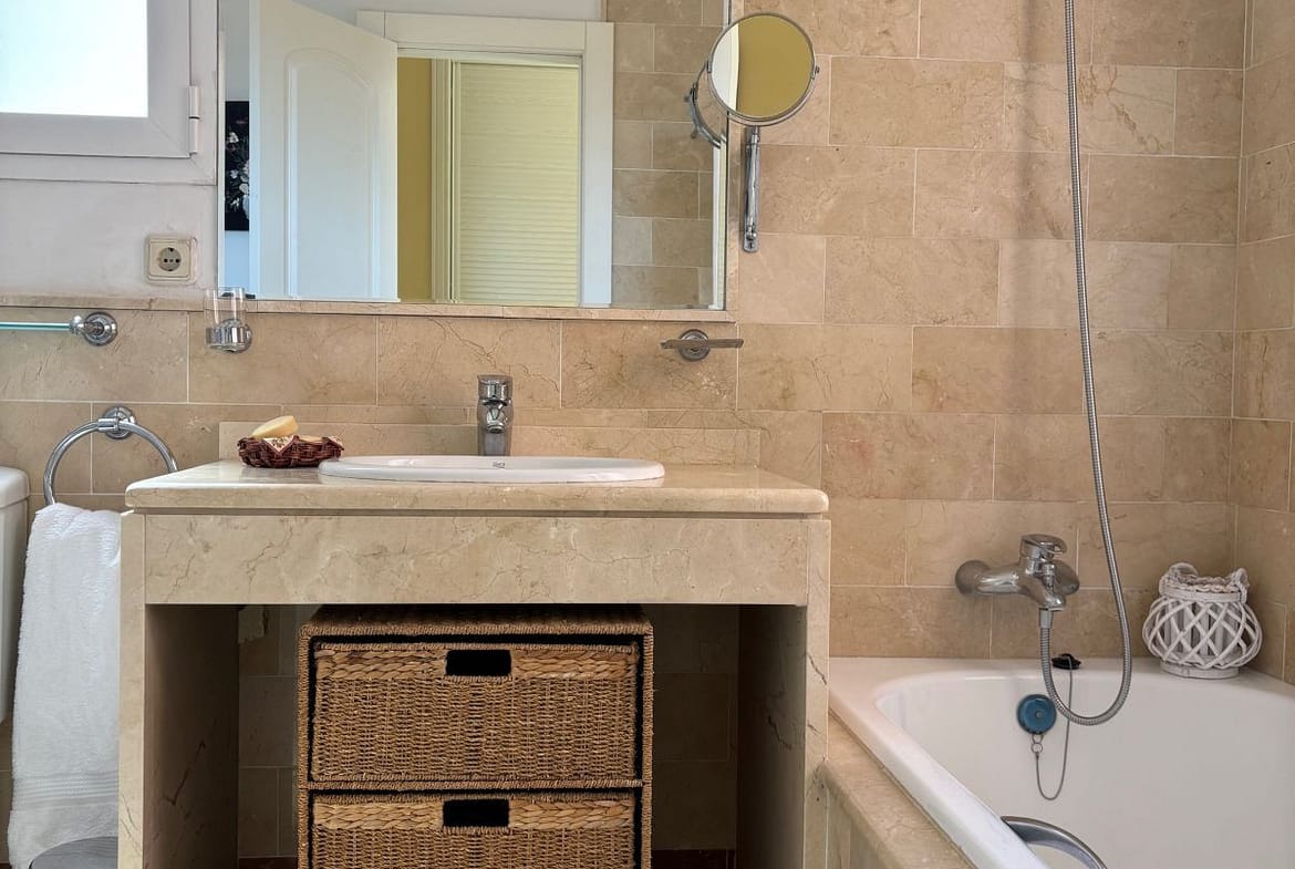There are three double bedrooms, where the master bedroom enjoys a full en-suite bathroom complete with bath and an overhead shower, the room has double glass fronted patio doors leading onto a terrace which enjoys afternoon sunshine due to its westerly facing. There are a further two double bedrooms with adequate storage/wardrobe space. Within this annex there is another bathroom with a standalone shower unit.