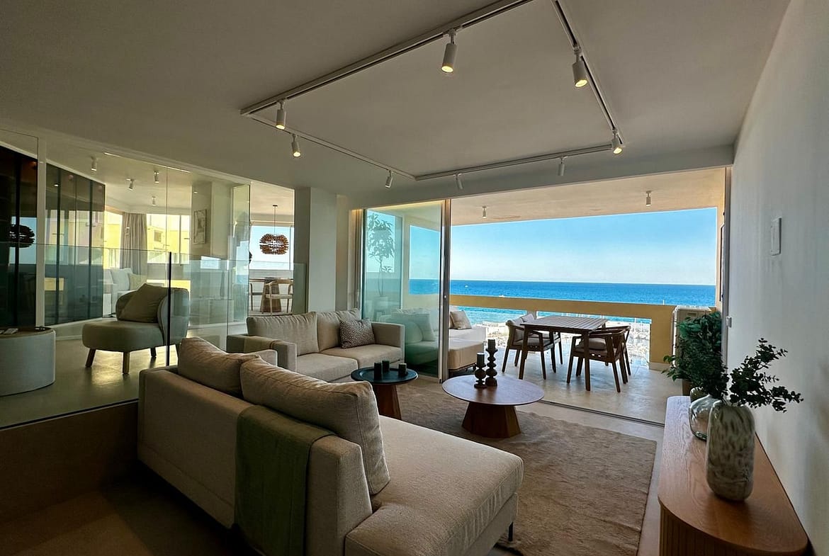 The spacious and bright living room flows seamlessly into an open-plan designer kitchen, fully equipped with state-of-the-art appliances. From here, you access a spectacular terrace where the stunning sea views take center stage — the perfect spot to enjoy unforgettable sunrises and sunsets.