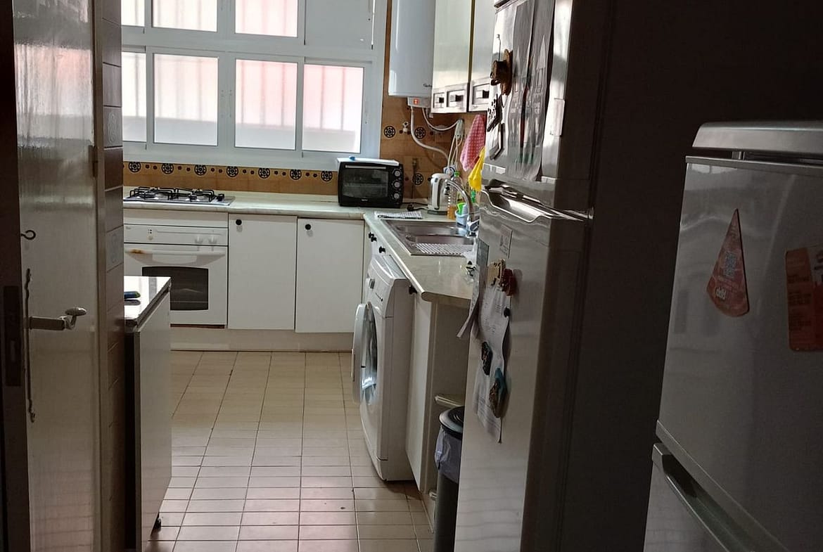 The apartment offers 91 m² of built area, currently distributed into 3 bedrooms and 2 bathrooms, providing great flexibility for a full renovation and the possibility to create a modern, open-plan living space tailored to your style. Its south-west orientation ensures plenty of natural light throughout the day and beautiful afternoon sun.