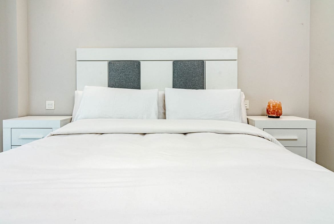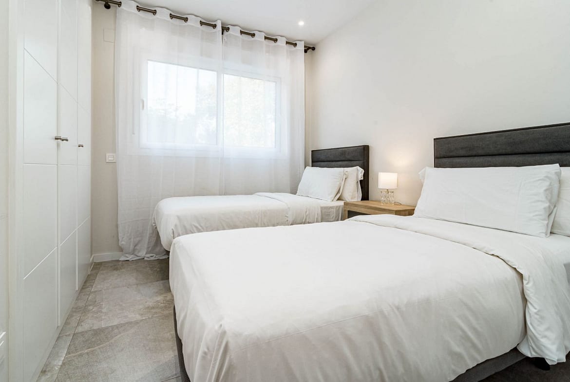 Its layout: upon entering, we find a spacious living room with an open kitchen. Both rooms connect to the covered terrace on the right side. To the left, we find a hallway with the guest bathroom on the left side. Directly opposite, there is a bedroom with built-in wardrobes. Following the hallway, we find another bedroom with wardrobes. At the far end is the master bedroom with a dressing area, an en-suite bathroom, and access to the large open terrace. All rooms are exterior-facing, with windows opening onto the private terraces. The home offers plenty of storage space; in addition to the bedroom closets and dressing room, the home also has a closet in the entryway and in the hallway connecting the bedrooms.