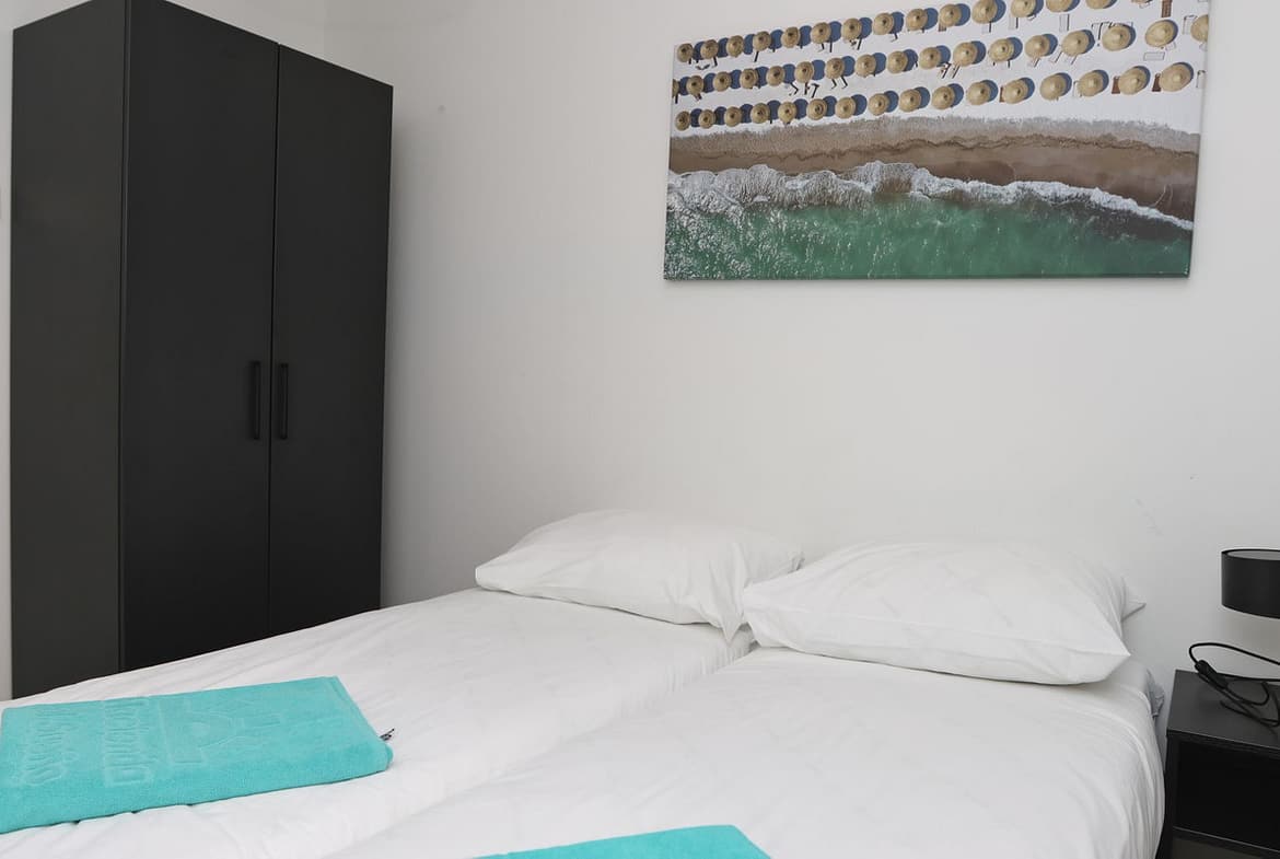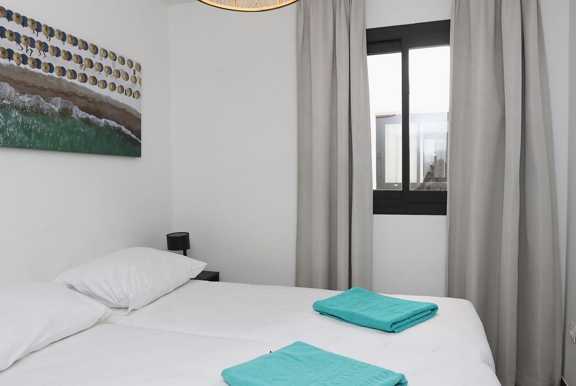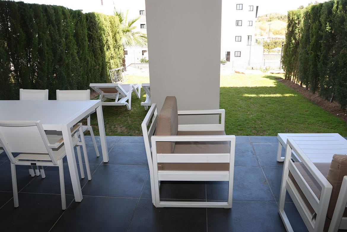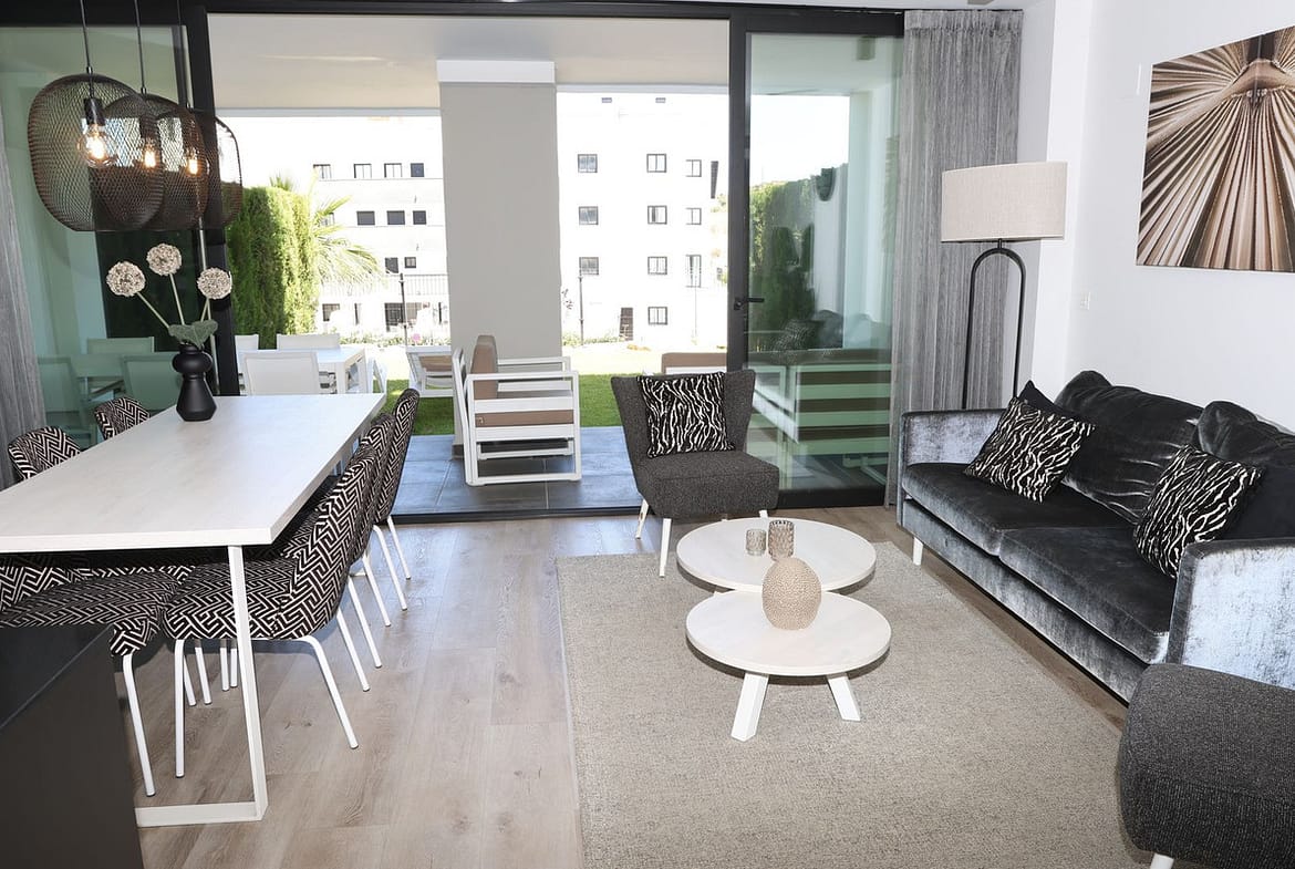 Enjoy your coming holidays in this contemporary ground floor apartment with a large private garden. Entering the apartment you have three bedrooms on the left of the hallway which leads you to the spacious living room with open plan kitchen, all beautifully decorated with furniture from the Netherlands. The wall to floor sliding terrace doors open up to a covered terrace and private garden. Complete with an underground parking spot and a very practical, spacious storage room at the entrance of the apartment. What makes this urbanization special is: heated pool, sauna, gym, laudry area, restaurant open all year, mini supermarket and concierge. Last but not least you can also enjoy the hotel style rental services offered on site.