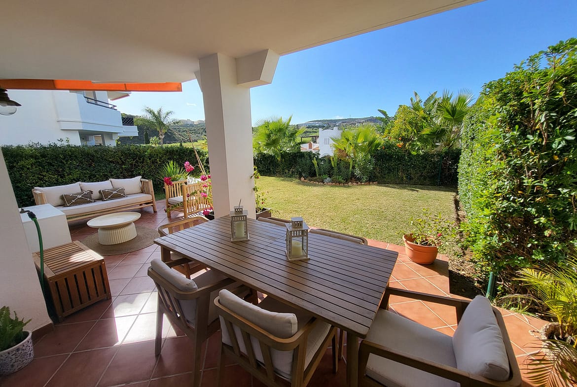 The generous living and dining area opens seamlessly onto a sunny terrace and spacious private garden with open views, ideal for relaxing, entertaining, or enjoying the Costa del Sol lifestyle. The fully fitted separate kitchen is complemented by a large utility room, perfect for everyday living. All three bedrooms are spacious, with the master suite boasting an en-suite bathroom and direct garden access through elegant terrace doors. The covered terrace and private garden create the perfect setting for al-fresco dining and outdoor living.