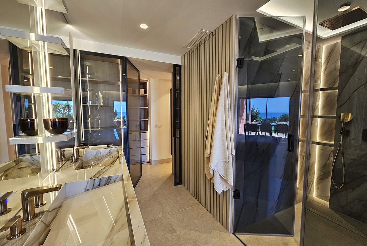 Walking in, you are met with stunning sea views stretching out to the horizon. The living space opens straight onto a large private terrace, making it easy to enjoy that indoor-outdoor lifestyle, whether you're winding down or hosting friends. The sound of the waves in the background just adds to the calm.