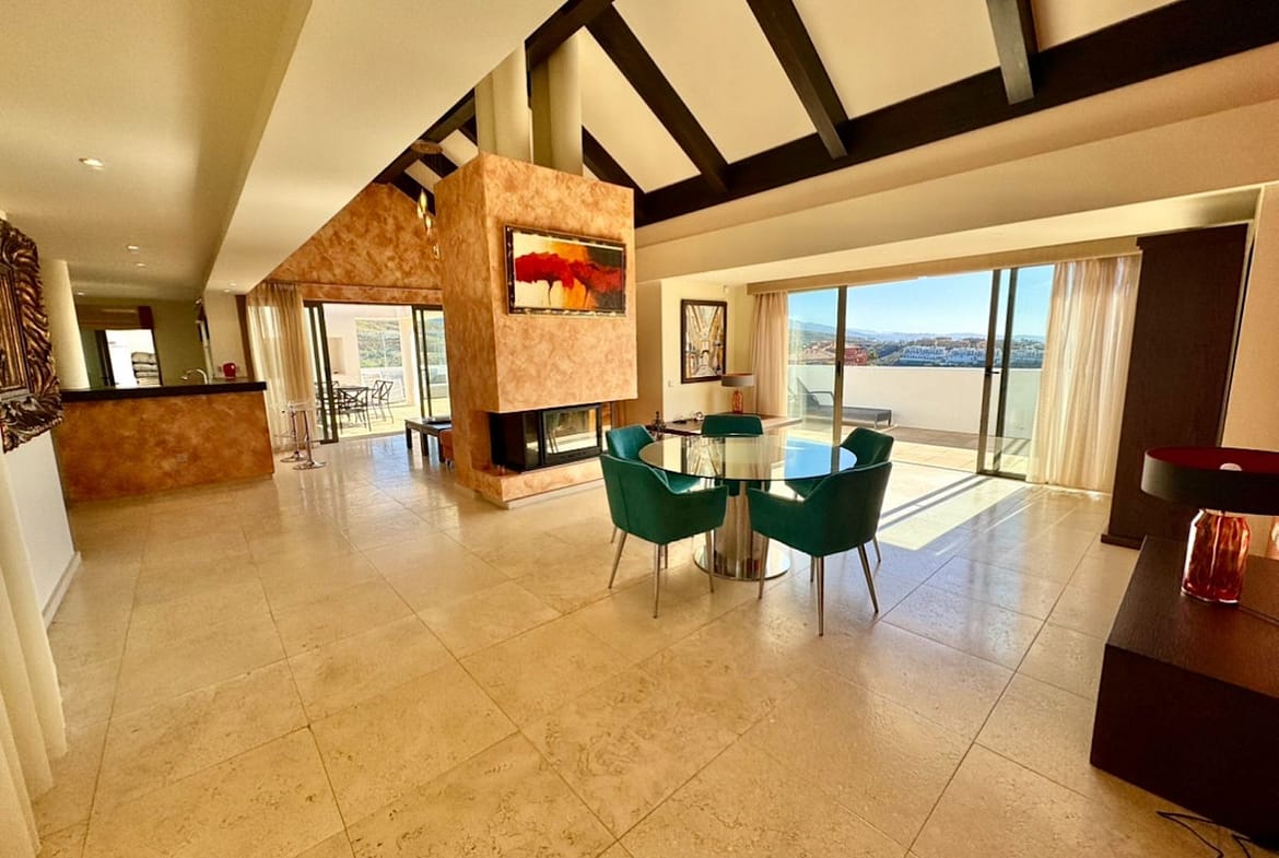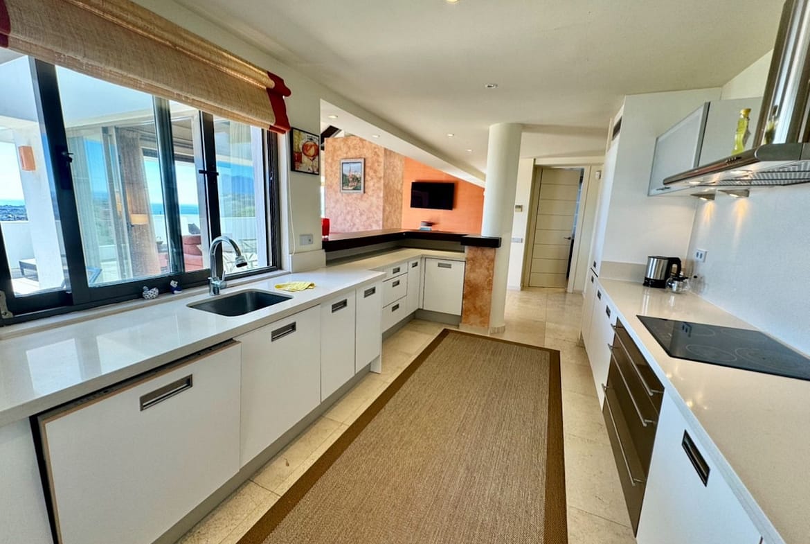 From the living area there is an access to the large terrace with panoramic golf and Mediterranean coastal