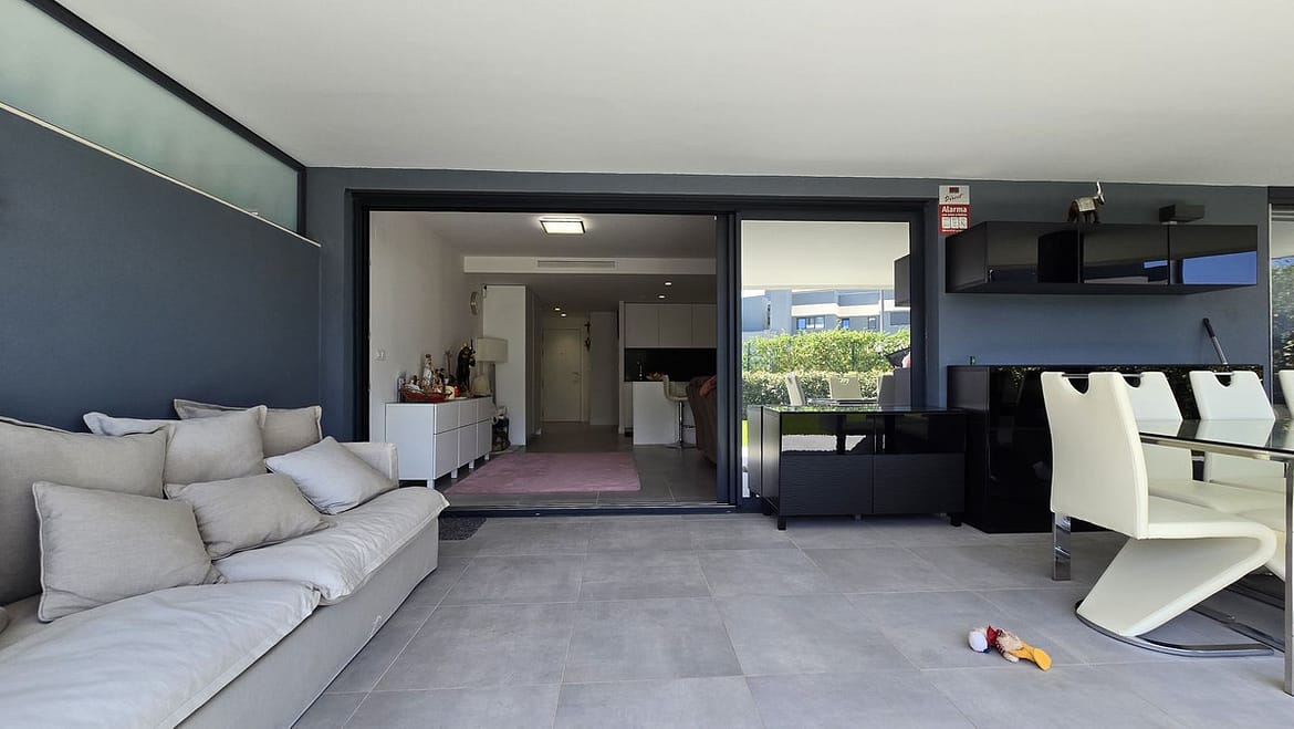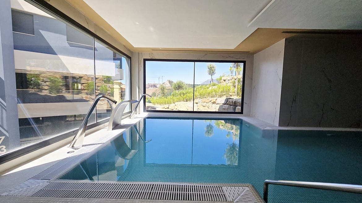 Between Estepona and Puerto Banus Modern 3 bedroom 2 bathroom corner ground floor apartment with wonderful garden and swimming pool views