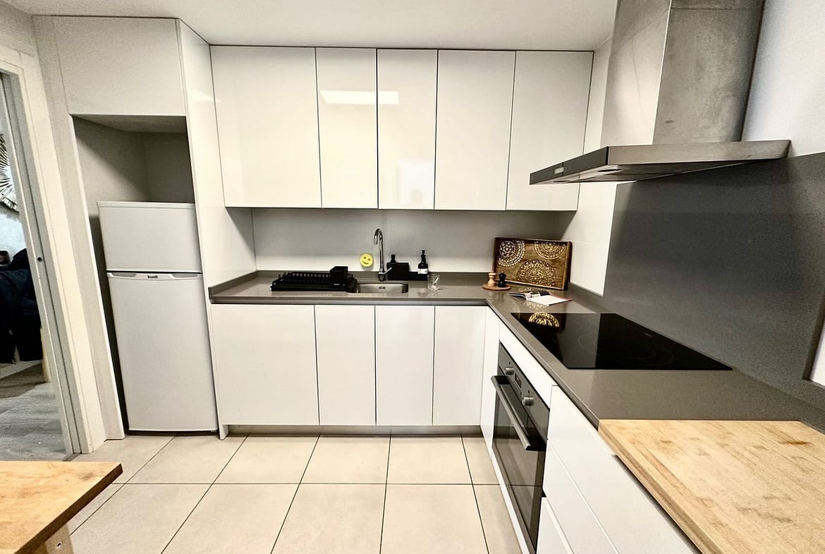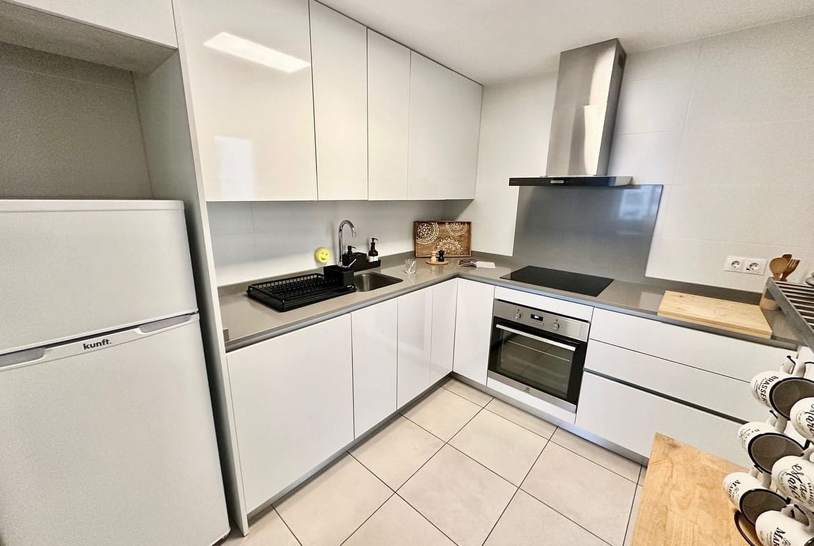 Modern furnished apartment has 3 bedrooms, 2 bathrooms, equipped kitchen with laundry room, large living room with access to the east-facing terrace.