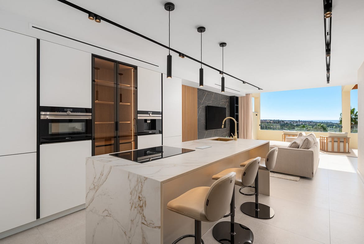 Apartment Jasmine is a beautifully renovated three-bedroom apartment for sale in the exclusive Palacetes Los Belvederes, an established residential community in Nueva Andalucía. Originally built in 2003 and fully modernised in 2024, this southeast-facing property offers 170 m² of carefully designed space, including 146 m² of elegant interiors and a 24 m² private terrace with panoramic views of La Concha mountain, the Mediterranean Sea, and a peaceful lake.