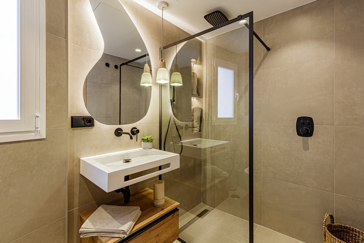* Secondary bathroom with stone countertop, built-in taps, LED-lit mirror, and designer shower.