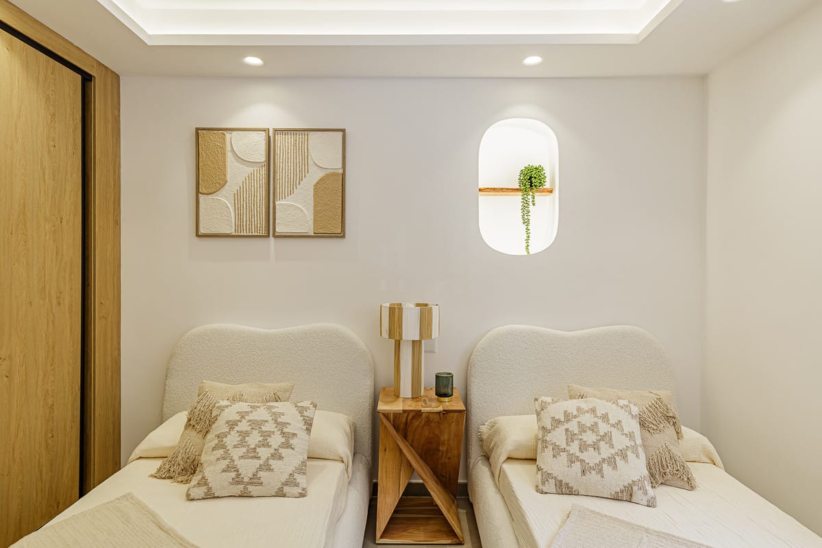 In addition, there are two spacious double bedrooms and a secondary bathroom with stone countertop, built-in taps, LED-lit mirror, and designer shower. Beyond its elegant design, the property stands out for its perfect southwest orientation, making it exceptionally bright and ideal for enjoying its magnificent 50 m² terrace. The terrace is enhanced with decorative wall lighting, tropical landscaping with automatic irrigation, an outdoor kitchen with sink, and a built-in Grandhall barbecue, as well as the comfort of a solar-heated outdoor shower—a unique space created to share unforgettable moments. This is a one-of-a-kind home, exquisitely decorated with the utmost attention to detail.