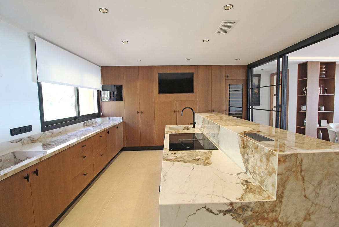 The kitchen is modern and functional, with a central island, high-end integrated appliances, and elegant finishes. It connects to the living area through a glass door, allowing for both openness and privacy.