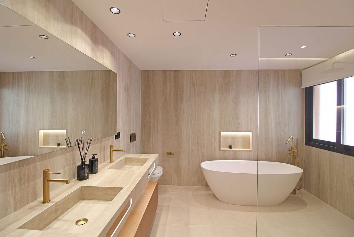 There are three bedrooms with en-suite bathrooms, plus a guest toilet. The master bedroom has access to the terrace, a walk-in wardrobe, and a designer bathroom with a freestanding bathtub, walk-in rain shower, and underfloor heating.