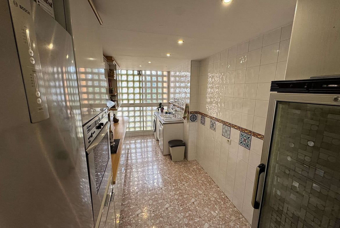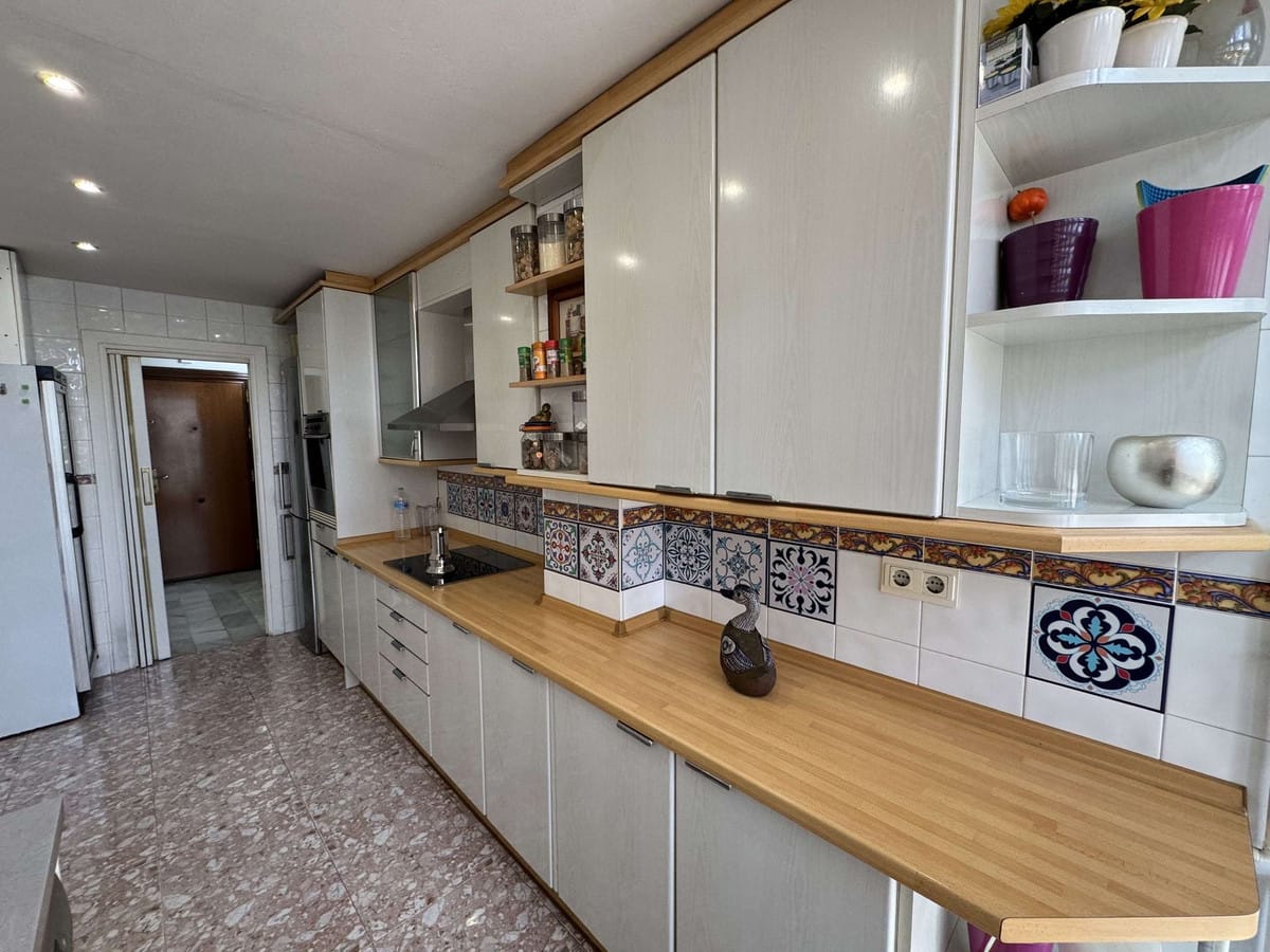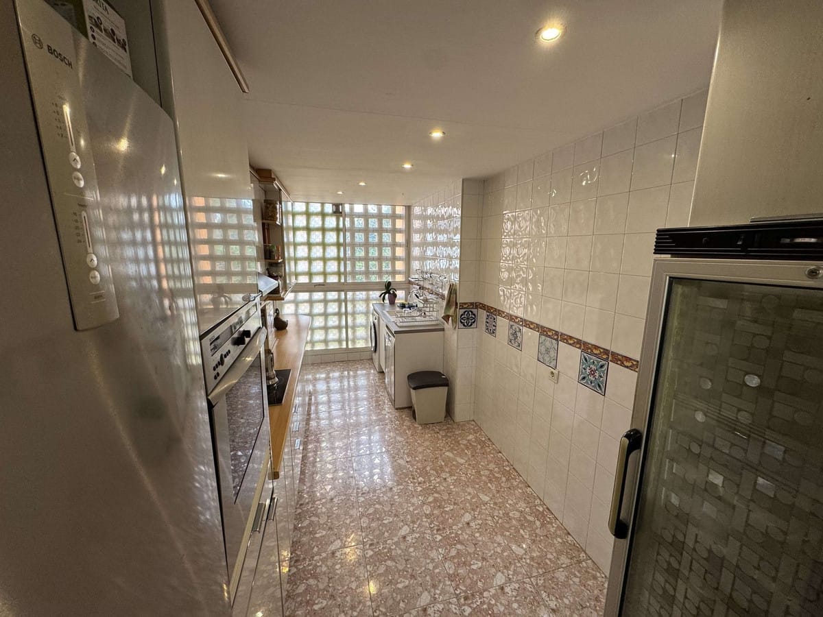 The property offers 120 m² built area (118 m² usable) and is distributed into a spacious and bright living-dining room with fireplace, a fully equipped independent kitchen with utility room, three generously sized bedrooms with fitted wardrobes, and two full bathrooms, one of them en suite featuring a walk-in shower, bidet, toilet and double washbasin. The apartment also benefits from a pleasant glazed terrace and a balcony.