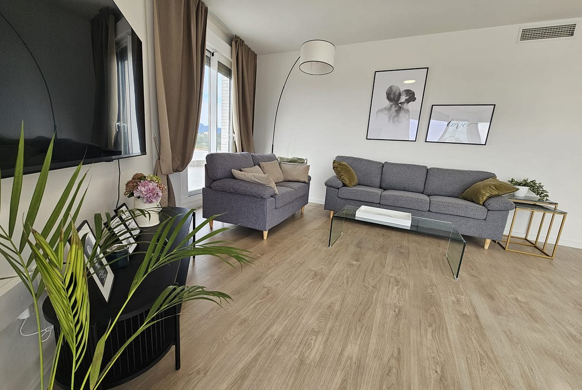 An elegant entrance hall that gives way to a spacious and bright living room with direct access to a spectacular corner terrace, ideal to relax and enjoy the landscape.