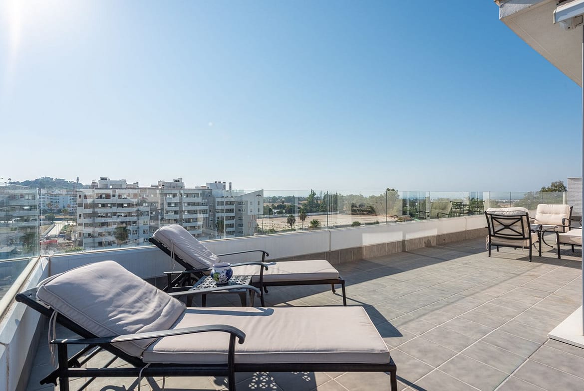 We are pleased to present this bright and modern penthouse in the best location in Nueva Andalucía! Enjoy modern living within proximity to all the amenities you need; grocery stores, bars, restaurants, schools, health center, golf courses, gym, and much more. A perfect choice for both families and investors. In a 20-minute walk you will reach the sea and the lovely promenade that stretches from San Pedro via Puerto Banús to Marbella Center. The apartment has three bedrooms, two bathrooms, a kitchen, a living room, and a terrace with generous spaces for relaxation and entertainment. A garage space and a storage room are included. Don't miss this unique opportunity to invest in one of Marbella's fastest-growing residential areas!