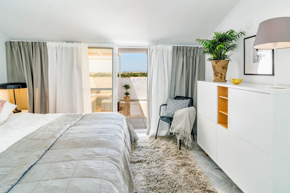 A duplex penthouse it has 3 bedrooms, 1 of which is on the entrance floor together with an en-suite shower. There is also a guest toilet on the same floor.