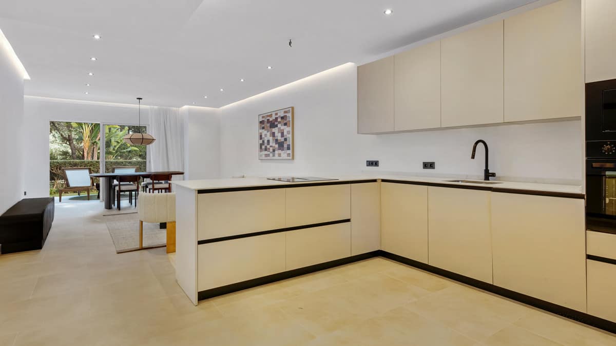 The apartment offers exceptionally generous living spaces, filled with natural light and finished to a high modern standard throughout. The spacious open-plan living and dining area connects seamlessly to a large private terrace, providing direct access to the garden, perfect for relaxing, outdoor dining, or enjoying the Mediterranean lifestyle all year round.