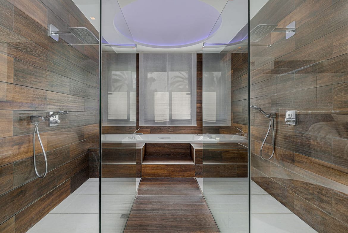 The amazing open living area is composed of a modern open plan fully fitted Siematic kitchen with cutting-edge design, ergonomics and superior home appliances such as a design Iphone kitchen extractor with boxes and integrated iphone doc; a dining area and a cozy luxurious lounge, all leading to a large attractive terrace itself opening up to the tropical gardens.