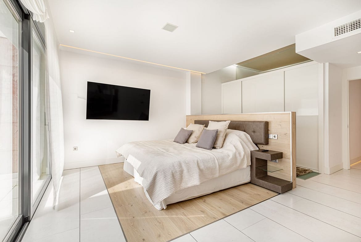 Completely renovated in 2014 with top modern design and with high quality materials, this property offers numerous extras such as a full domotic system that controls the electric blinds, the cold / hot air conditionning system, the underfloor heating and the many led lightings throughout the whole apartment; a music system with integrated speakers in the ceiling in each bedroom; Hansgrohe fittings and Porcelanosa ceramic tiles in the bathrooms; a full shower room/toilet on the living area level, as well as a storage/utility room.