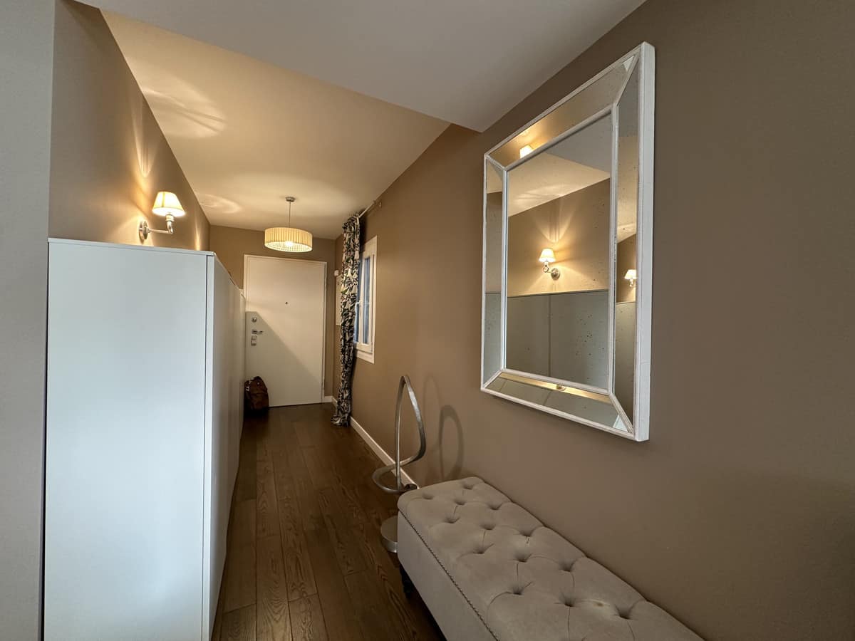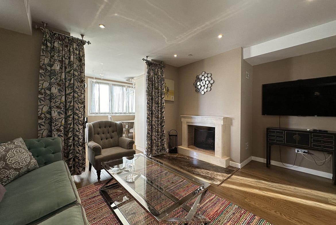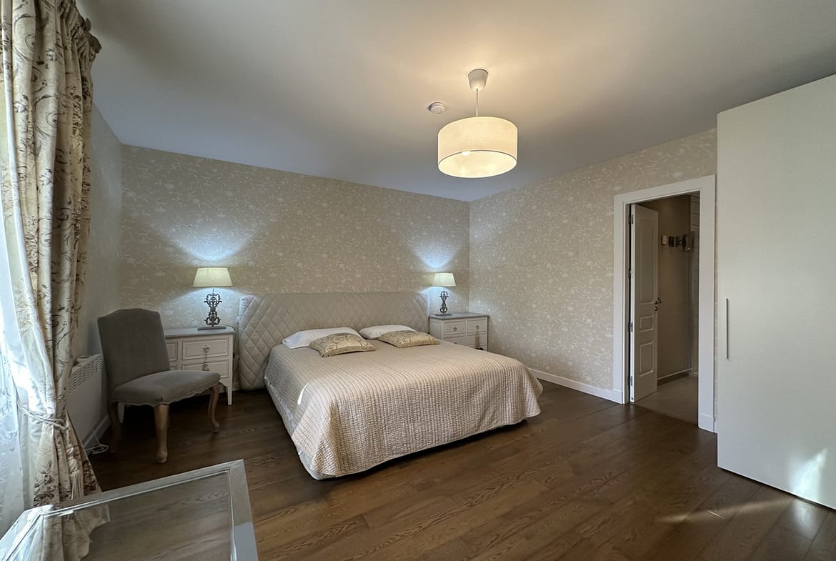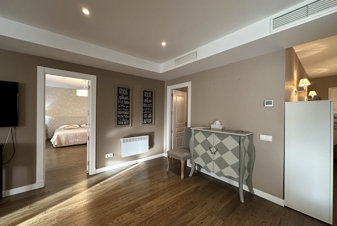Upon entering the apartment, you are greeted by a spacious living room with a fireplace, perfect for cozy evenings. The apartment is fully furnished and features parquet floors and wooden floors, adding to its elegant and sophisticated style. The dining room is separate, creating a defined space for enjoying meals with family and friends.