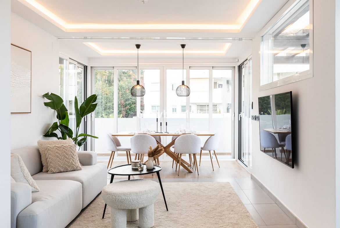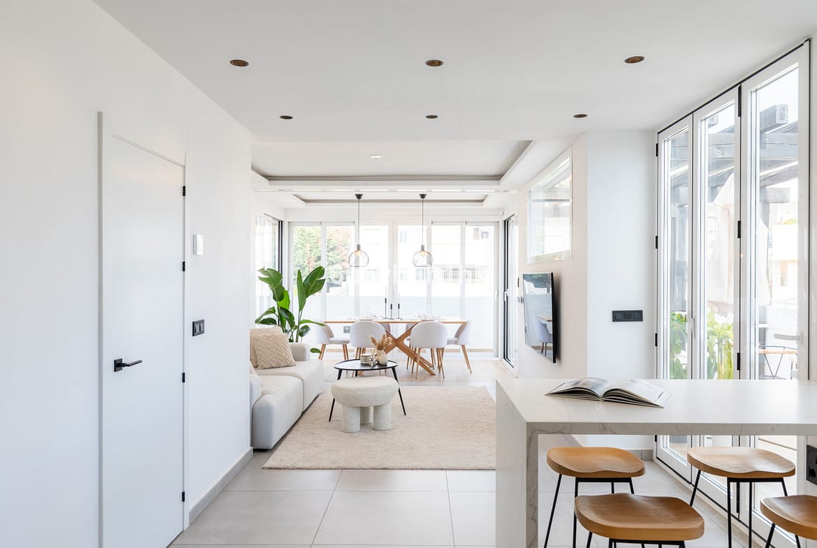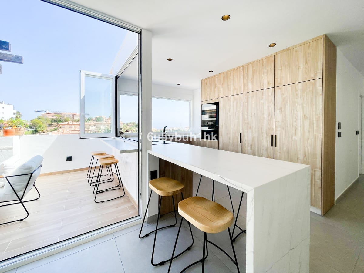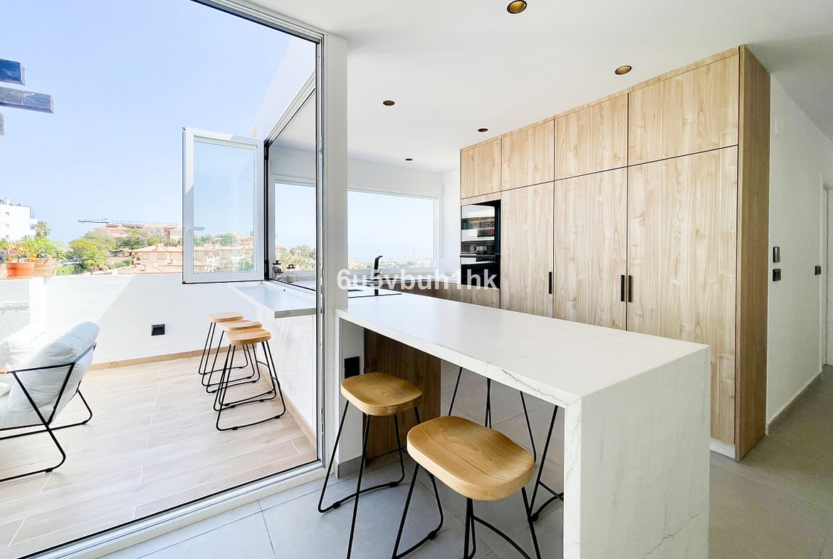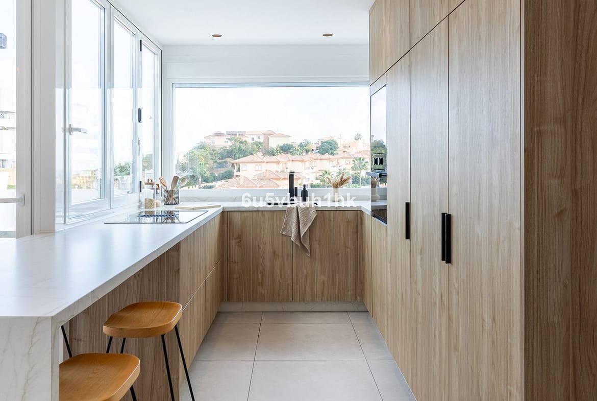 The apartment has a fully equipped open kitchen with integrated high-end appliances. It features an elegant island that can extend outdoors, allowing you to enjoy the pleasant climate of the Costa del Sol, creating a perfect atmosphere for both cooking and entertaining friends and family.