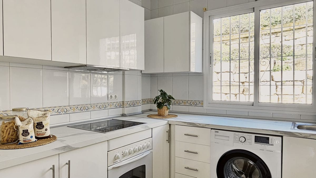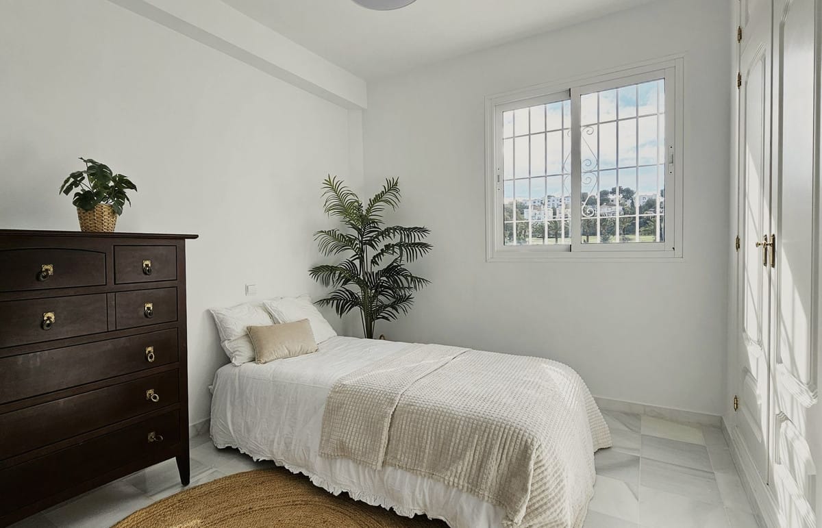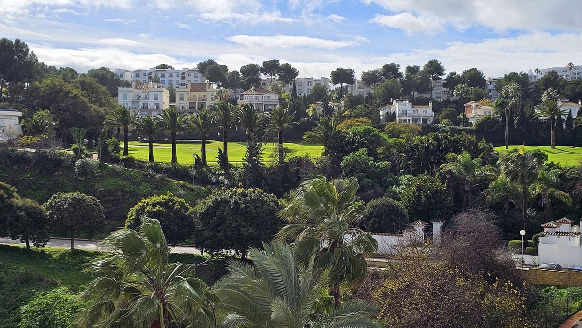 Beautiful 3 bedroom + 2 bathroom apartment for sale in Miraflores area. Spacious south & west facing covered terrace with open green views to the Miraflores golf course and gardens. Nice and quiet location only few minutes drive away from the beach village La Cala de Mijas and the amenities in Riviera del Sol.