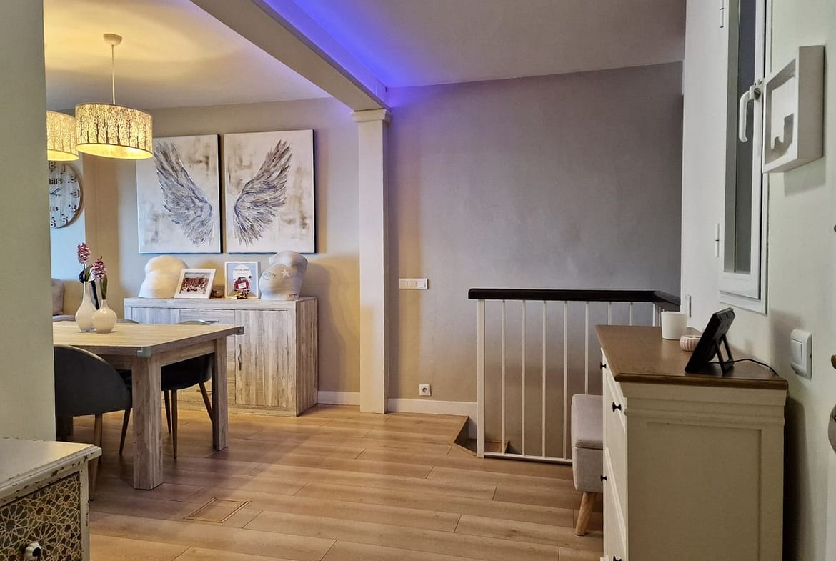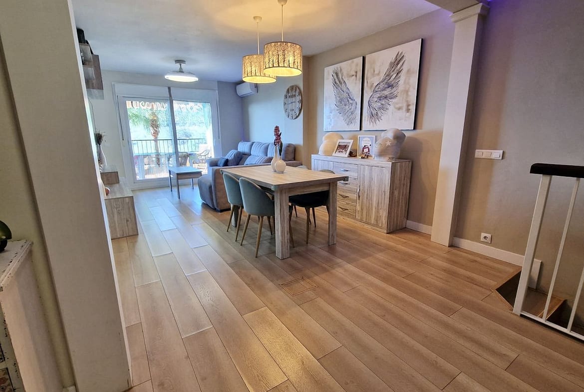 Immaculate, beautifully reformed, spacious ground floor duplex apartment with 2 terraces, private garden AND sea and pool views!! Located in a quiet corner of this fabulous community, the apartment, at entry level, consists of hallway,, large lounge/dining room, modern fully equipped kitchen, double bedroom (currently used as an office), bathroom and a wonderful terrace from which stunning sea, garden and pool views can be enjoyed. Downstairs, we find another double bedroom, master bedroom with ensuite bathroom and another terrace, again with beautiful views. Then the lovely recently renovated private garden, with grass, plants, fruit trees and a laundry area. There is parquet flooring throughout the property, with the exception of the bathrooms and kitchen. The property also has a storage room of 6m2.