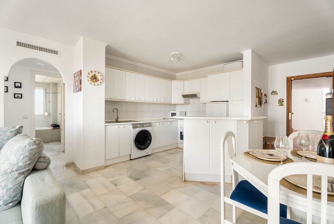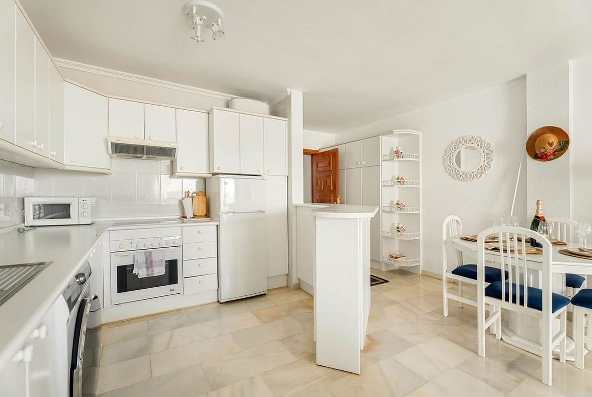 With a generous and thoughtfully designed layout, this apartment welcomes you with a bright, airy living and dining area, filled with natural light thanks to sliding glass doors that lead directly onto a private terrace. From here, you are treated to spectacular views of the Mediterranean Sea, making it the perfect place to relax, entertain, or dine al fresco while enjoying the serene coastal backdrop.