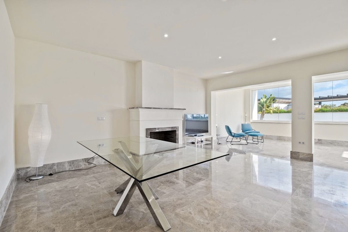 The property comes with covered private parking and there are a few steps from the parking to the front door of the property. Once inside, the hallway presents a kitchen to the right, the stairs to the upper level to the left, and ahead is the entrance to the huge open-plan living and dining room, and this is where the potential of the property is most interesting. A very impressive space with high ceilings, marble floor, fireplace and a access to terrace. Infact, the original configuration of the property has been changed to bring the old terrace into the main living area, which has been done using glass curtains….an alteration which is not really very satisfying and this is one of the aspects which should be addressed by the new owner.