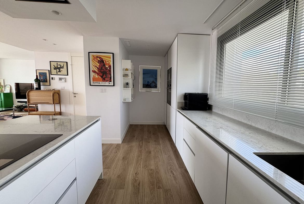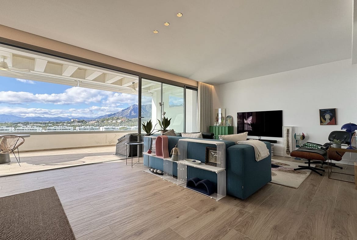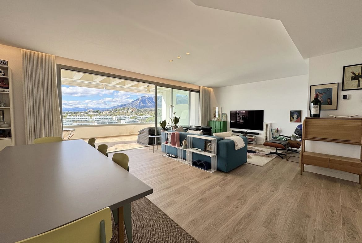 The living room with designated dining and lounge area is very wide and gives access to the covered terrace with open views to the sea and mountains.
