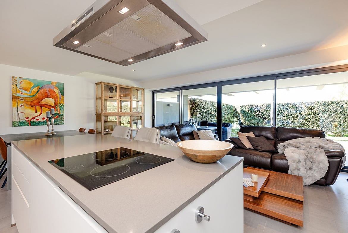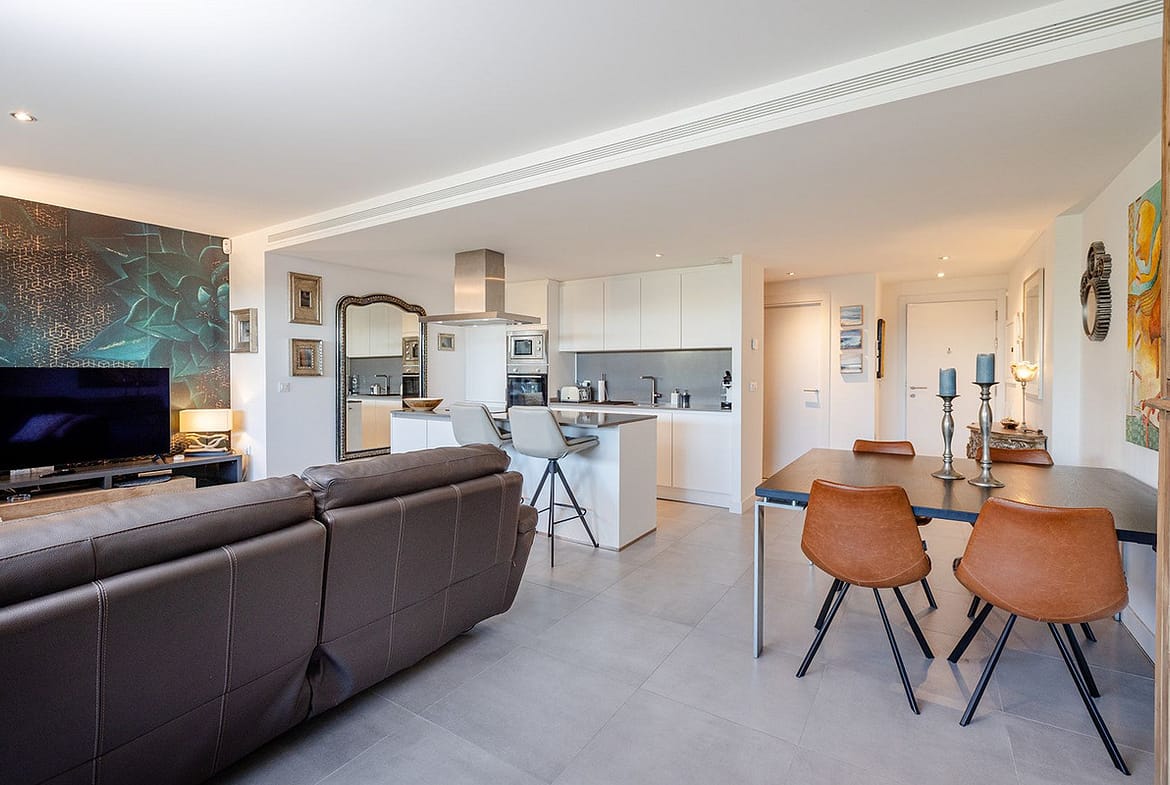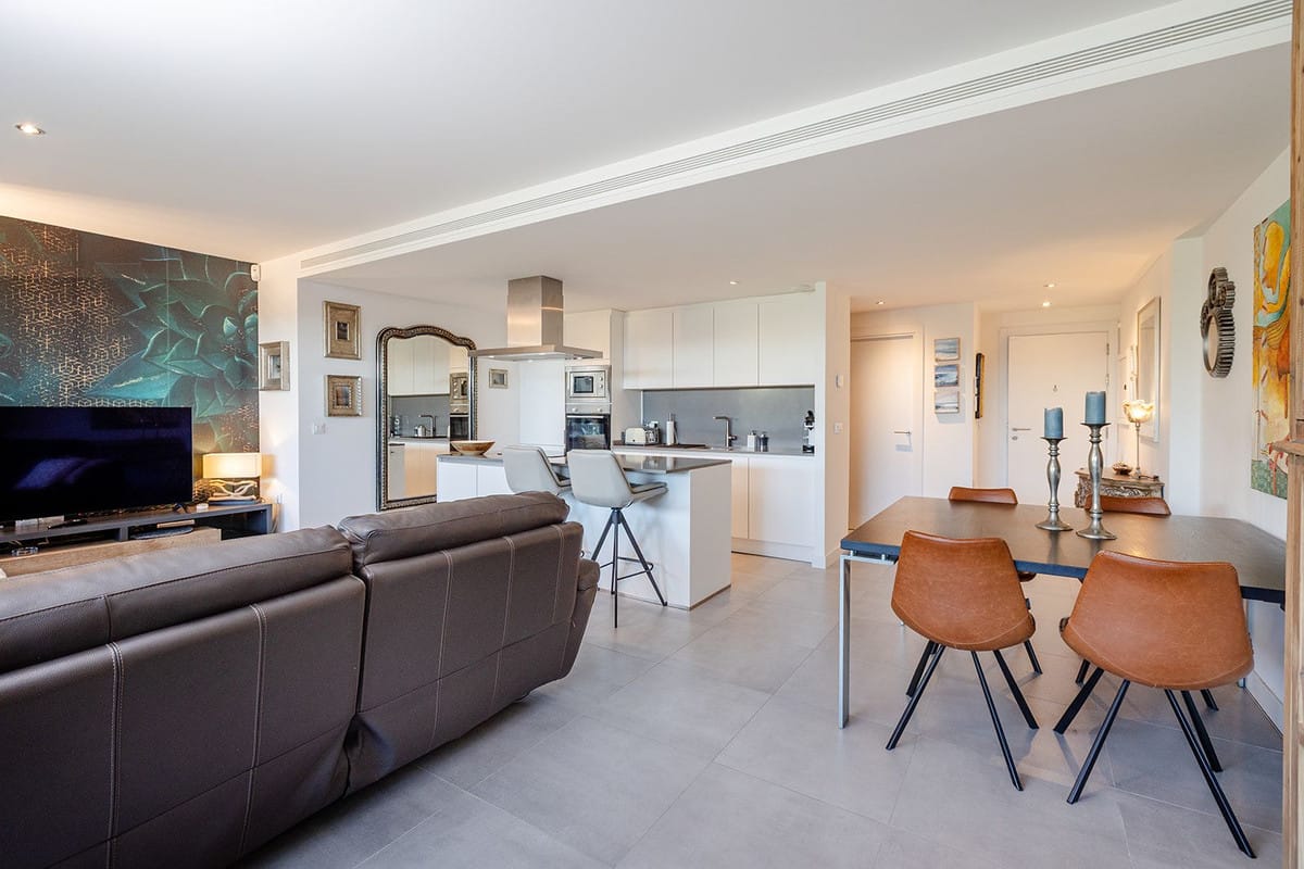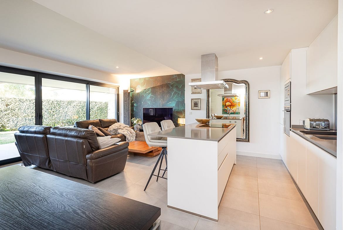 The apartment features a spacious open-plan living and dining area with large sliding glass doors that open directly onto a private garden, seamlessly blending indoor and outdoor living. The modern, fully equipped kitchen is finished to a high standard, perfect for both everyday use and entertaining.