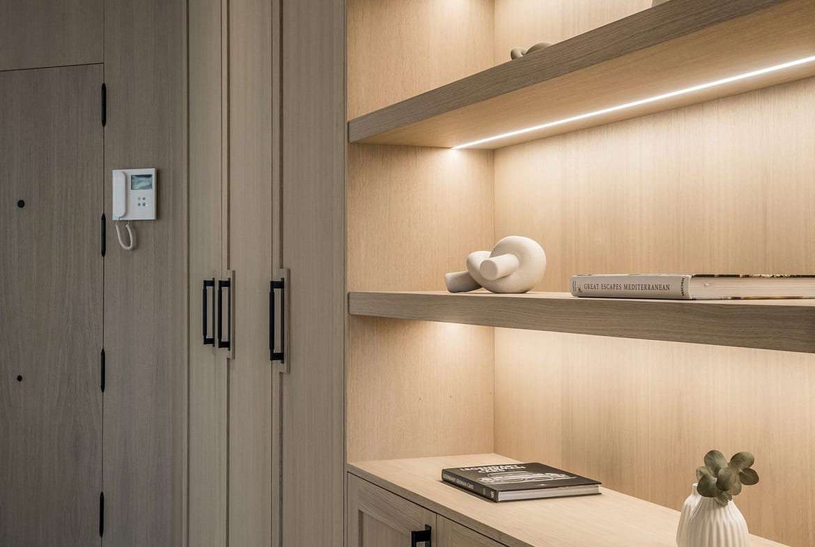 The three bedrooms are refined and sophisticated, featuring wooden accents, bespoke wardrobes, and flattering LED lighting throughout. The elegantly decorated bathrooms are crowned with luxury showers and faucets from Dornbracht, where the grand master bathroom is completed with a bathtub and double vanity.