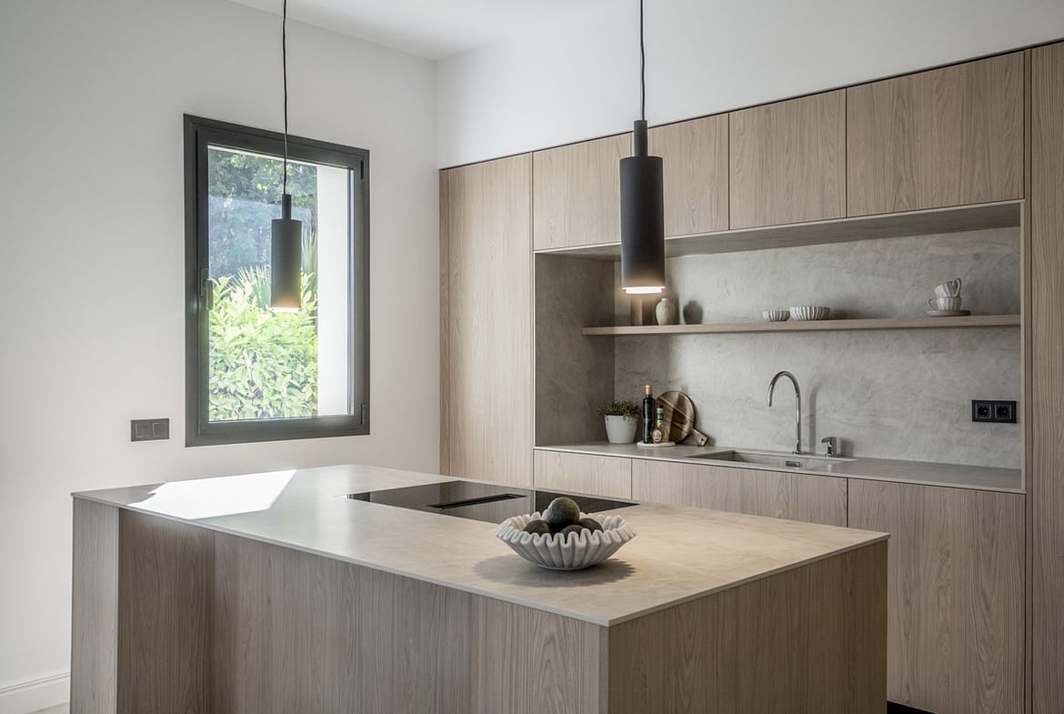 Entering the living area, you are greeted by a bespoke kitchen that exudes both elegance and functionality. It features stunning deep wooden accents on the island and cupboards, complemented by a soothing ‘Taj Mahal’ marble countertop. With ample storage, generous counter space, and a wine cooler, it is a modern kitchen that is incredibly functional for those who enjoy cooking and gatherings. The living room area is warm and inviting, featuring a majestic TV-wall with a spacious bench that offers ample storage.