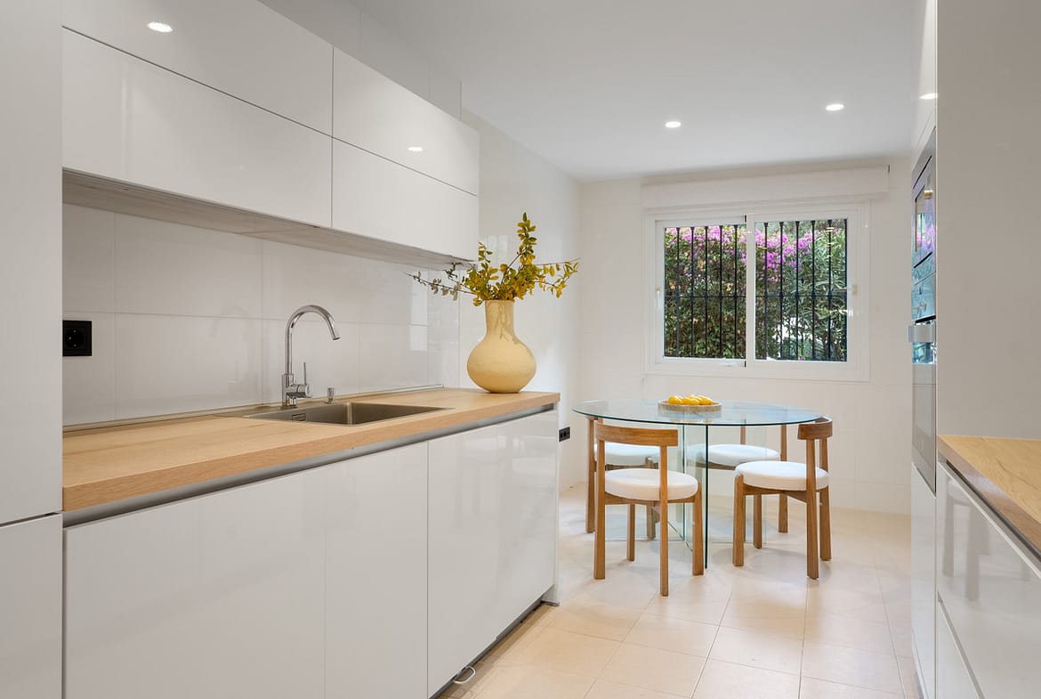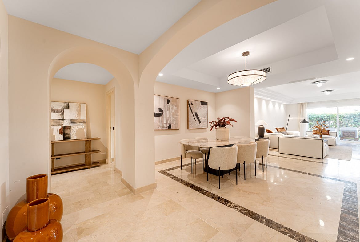 The entrance opens onto a spacious hallway that immediately conveys the apartment’s generous character. To the right is the main living room with a separate dining area, a large space enriched with natural light and direct access to the covered terrace and private garden. This outdoor extension offers an ideal setting for morning coffee, relaxed reading, or quiet evenings overlooking the landscaped surroundings. On the opposite side of the living room is the kitchen with a breakfast area. The adjoining laundry room is discreetly positioned, supporting the home’s clean aesthetic and keeping household tasks out of sight.