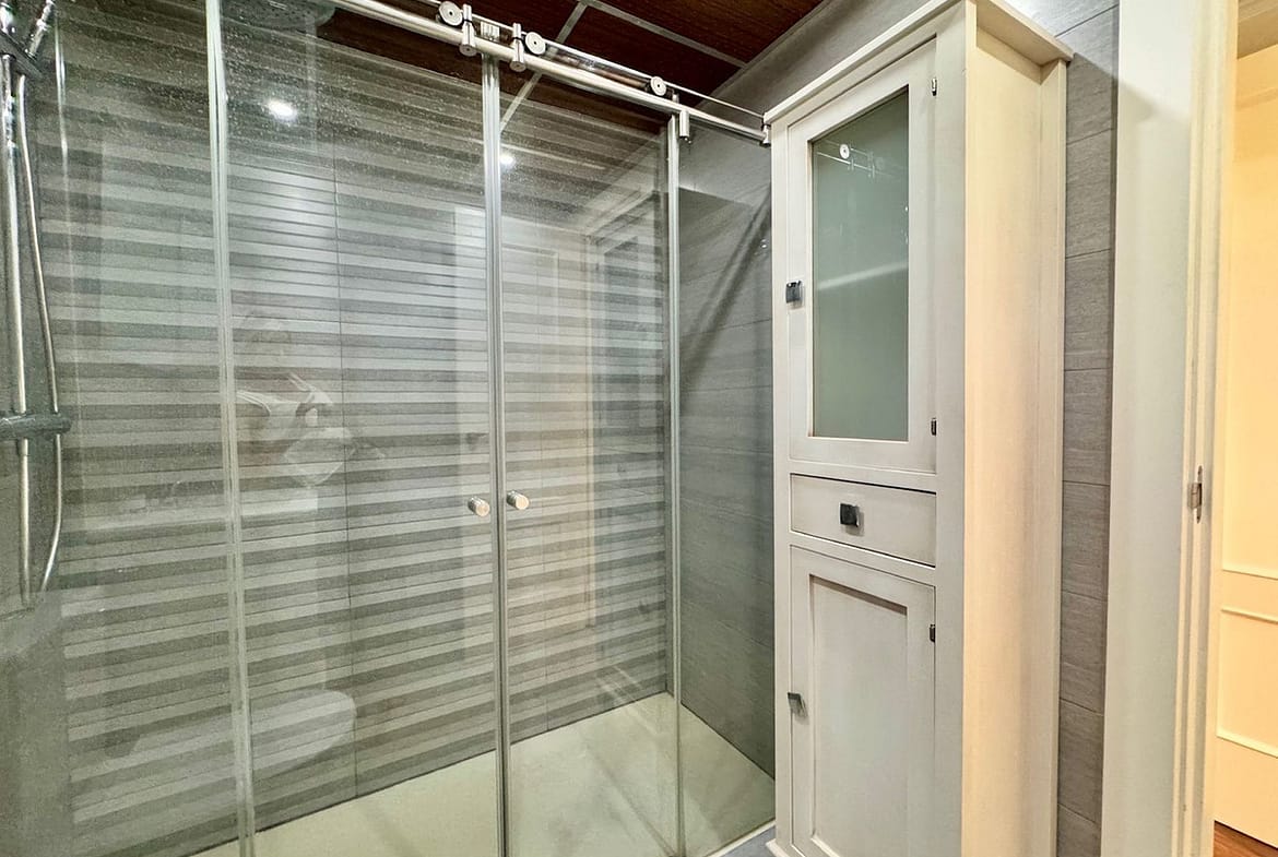 Master bedroom with access to the terrace, built-in wardrobe, and en-suite bathroom with a walk-in shower