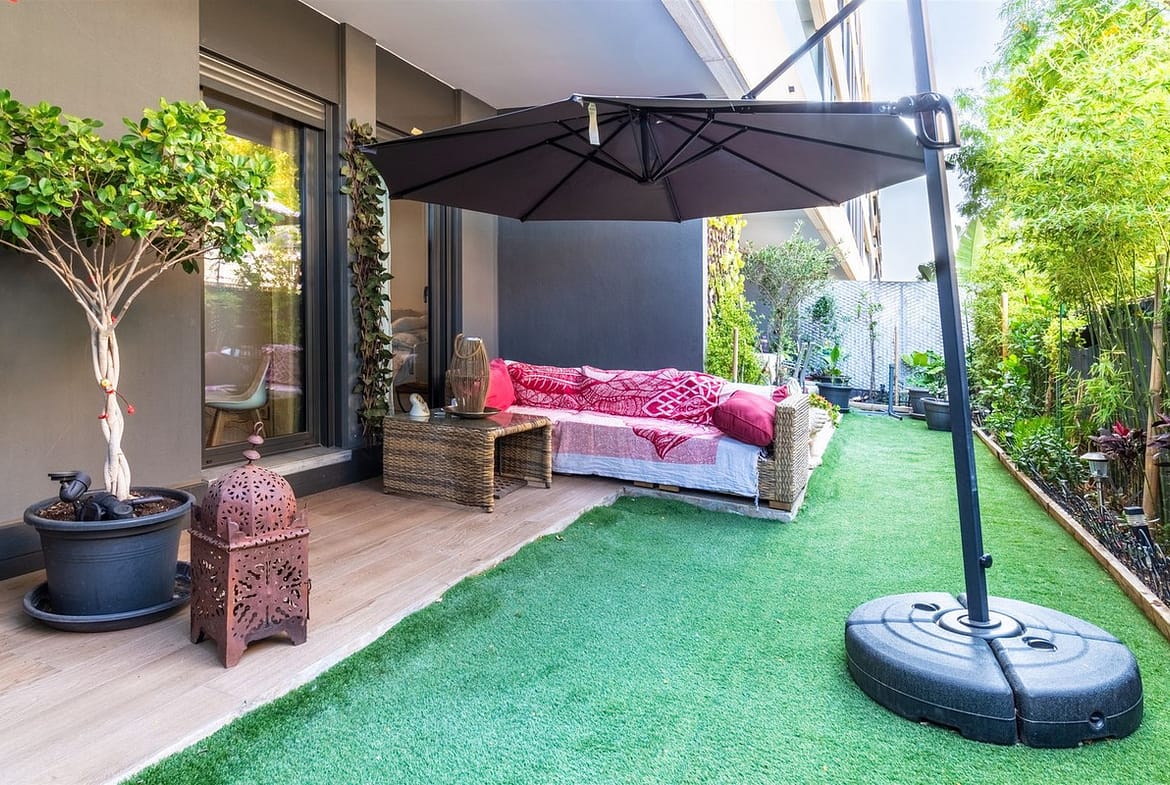 On the terrace: an electric awning and artificial grass, creating a practical and comfortable outdoor space.