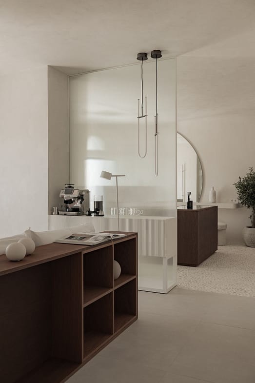On the main floor, a fully equipped kitchen with a central island for sharing moments. A dedicated wine space, a dining area by the sea-view window, a spacious living room with TV, and a terrace perfect for outdoor dining. For maximum comfort, there’s a guest toilet and a convenient laundry room. Two en-suite bedrooms complete the ground floor. The master suite is divided into two areas: a restful zone with access to a private terrace, and a second space featuring a walk-in closet, bathroom, makeup table, double sink, and a rain shower by the window with breathtaking views, plus access to another terrace with an outdoor bathtub.