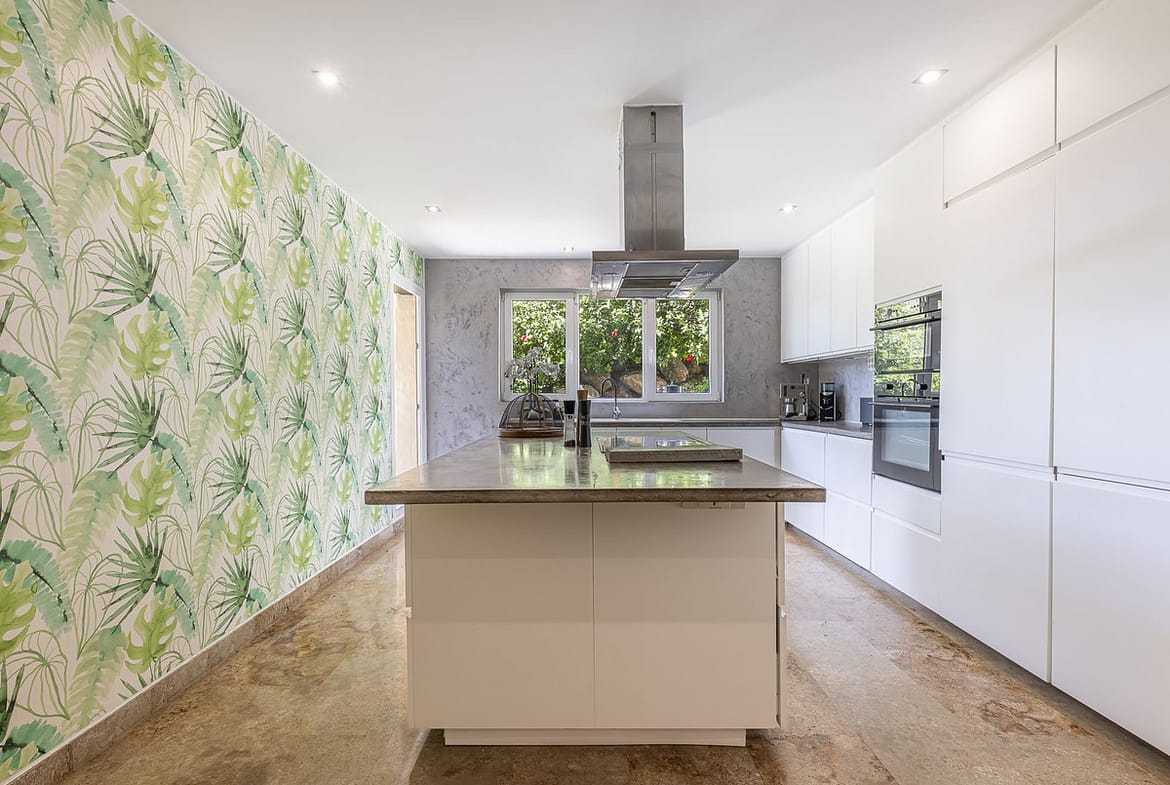 The kitchen has been renovated and includes a laundry area on a separate terrace. The living and dining room feature a fireplace and open onto a large terrace with lovely views of the pool and the sea.