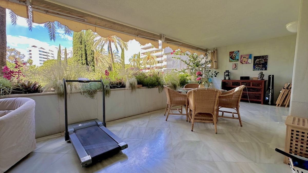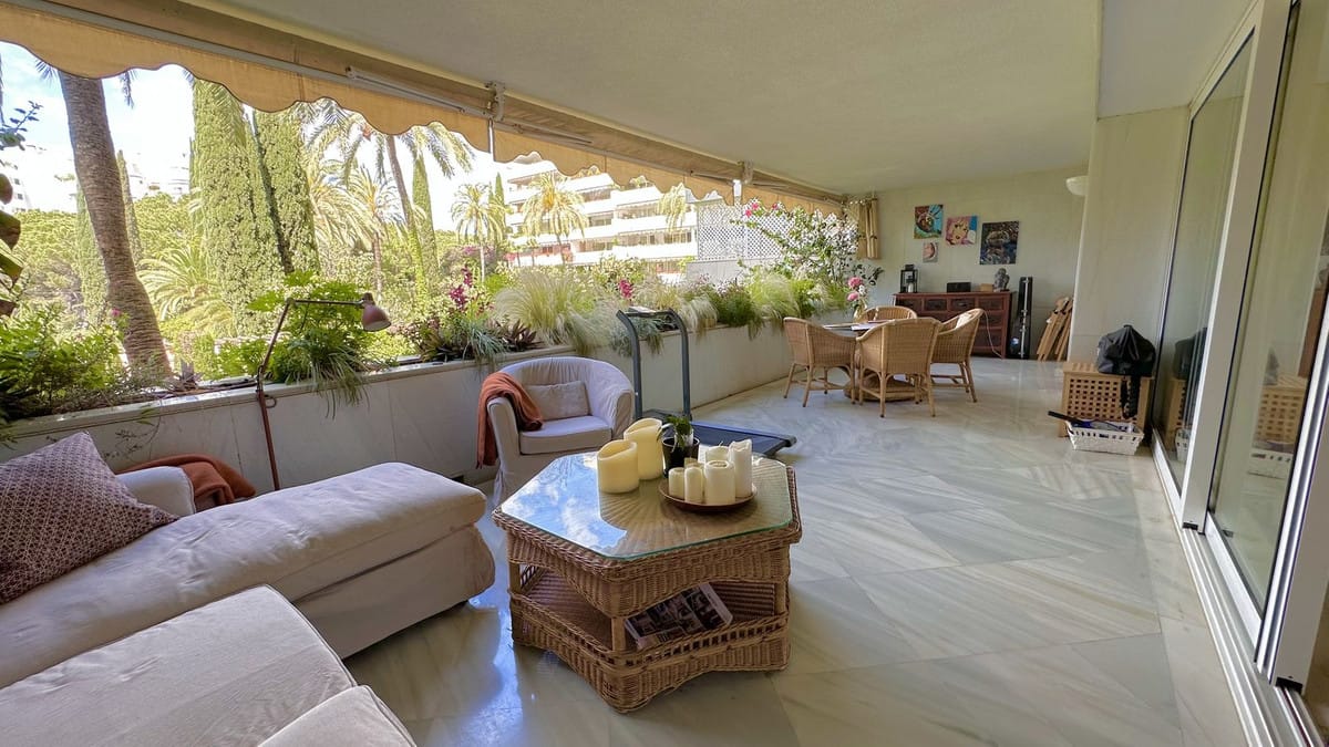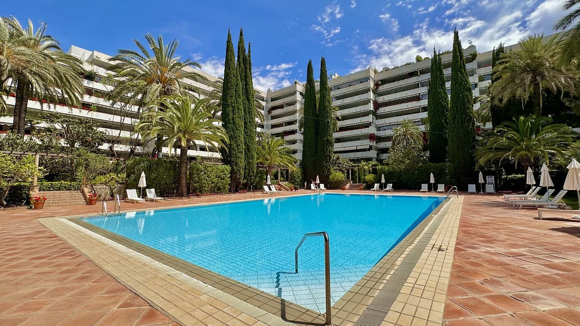 Beautiful and very private apartment in the prestigious complex, located in the center of Marbella, on the second line of the beach and the famous Paseo Maritimo. The complex offers beautiful gardens with two swimming pools, one for children, 24 hour security and concierge service. There is als a new gym with SPA under construction. The apartment offers beautiful views to the garden and pool and has West orientation, it consists of an entrance that leads to the large living room with access to the terrace, the renovated kitchen with the laundry room, the master bedroom en-suite with access to the terrace, two other bedrooms with their bathrooms. The bathrooms are renovated. An ideal property for investment, permanent or vacation residence.