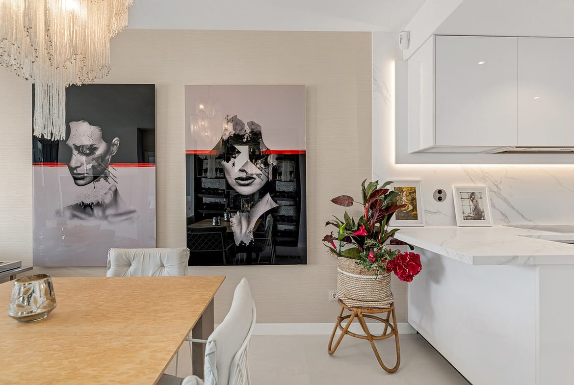 The apartment features three bedrooms and two bathrooms, including a master suite with private access to the terrace. The spacious open-plan living and dining area flows seamlessly into a fully equipped modern kitchen with high-end appliances. Large windows ensure abundant natural light, enhancing the sense of space and connection with the outdoors.