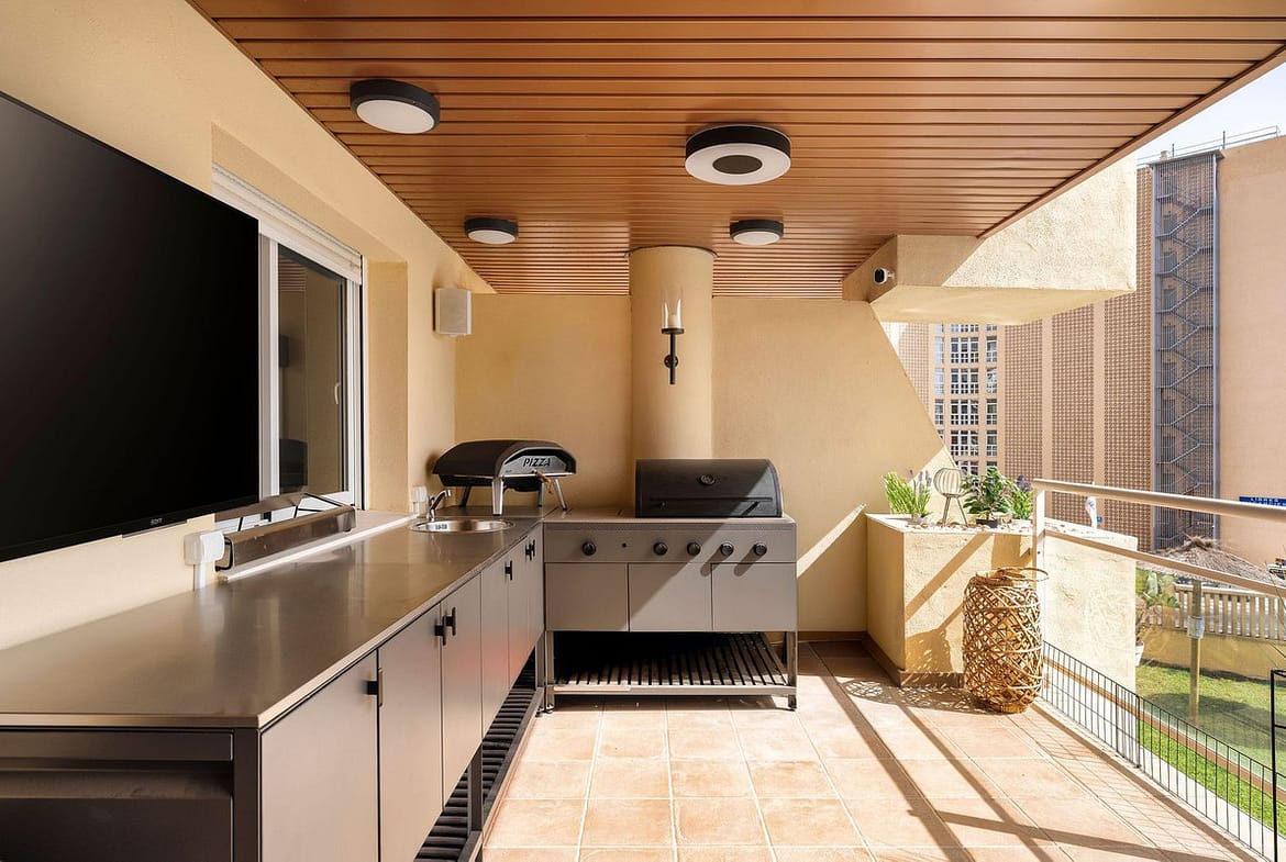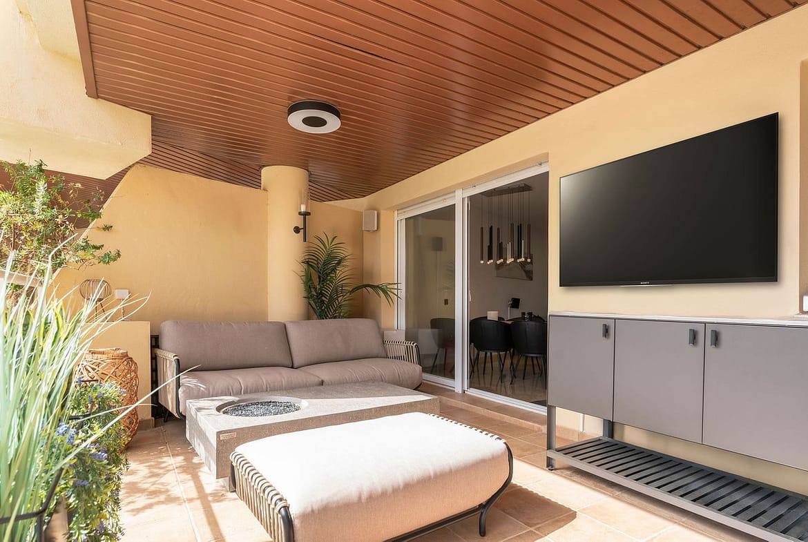 Enjoy a bright and inviting living space with elegant marble flooring, and direct access to a large covered terrace with south west orientation, offering views of the pool and partial sea views.