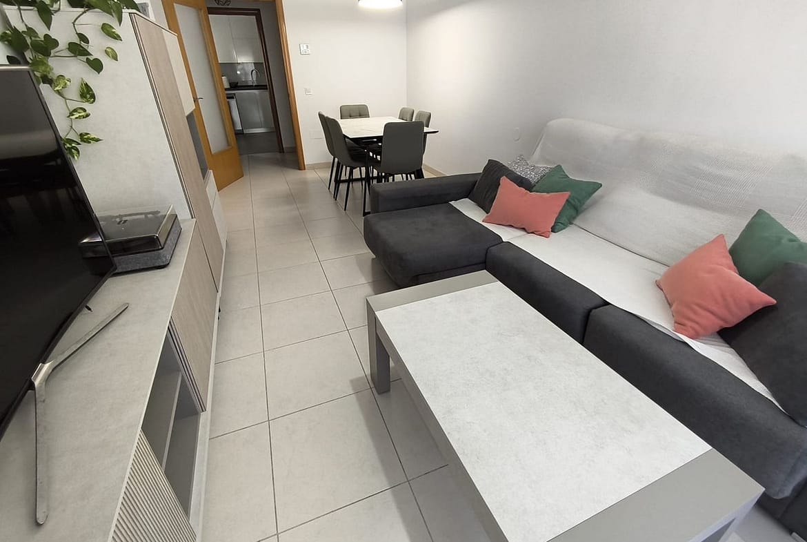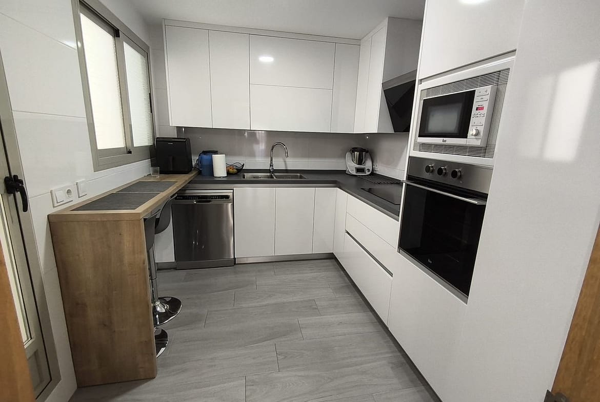 The property features 3 bedrooms with built-in wardrobes, 2 full bathrooms (one of them en-suite in the master bedroom), a separate fully fitted kitchen with appliances, and a bright living-dining room with direct access to a pleasant terrace of approximately 11 m², perfect for enjoying the wonderful climate all year round.