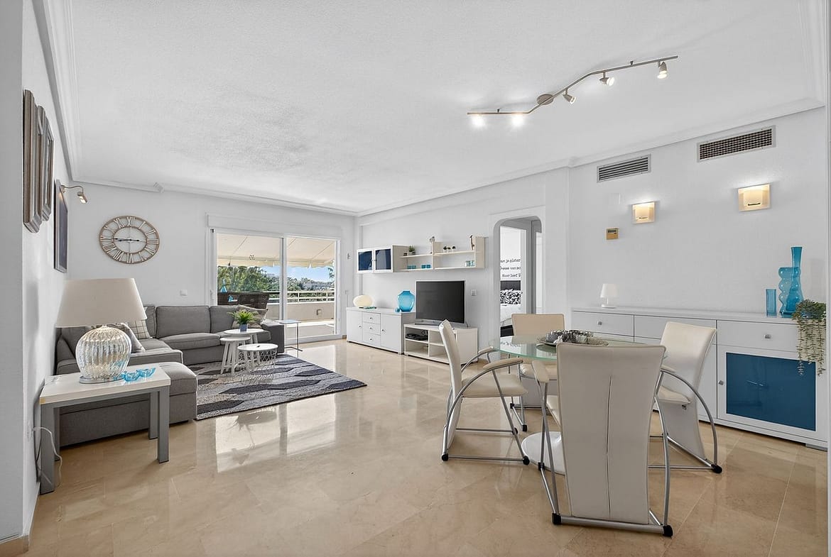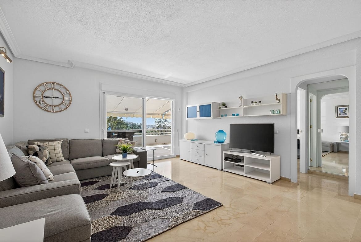 The bright and spacious living room opens directly onto the terrace through sliding doors, creating a seamless indoor-outdoor lifestyle.